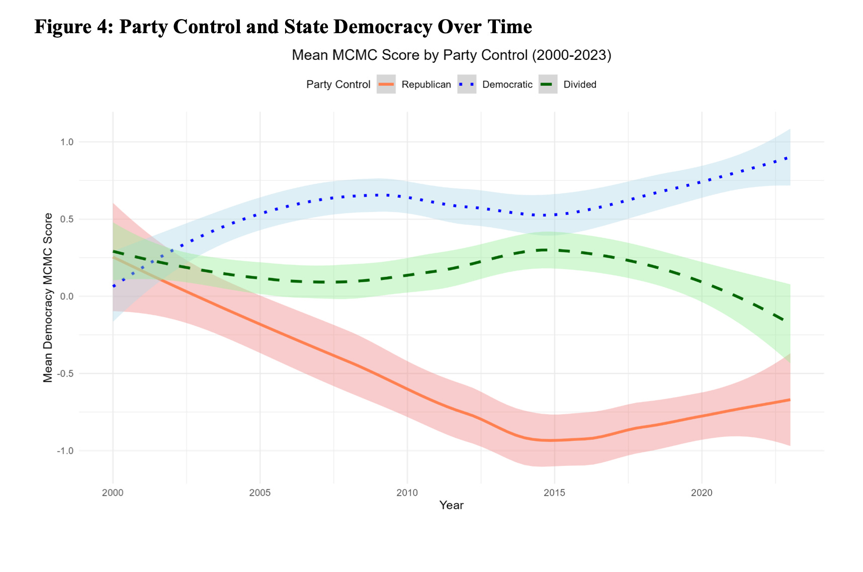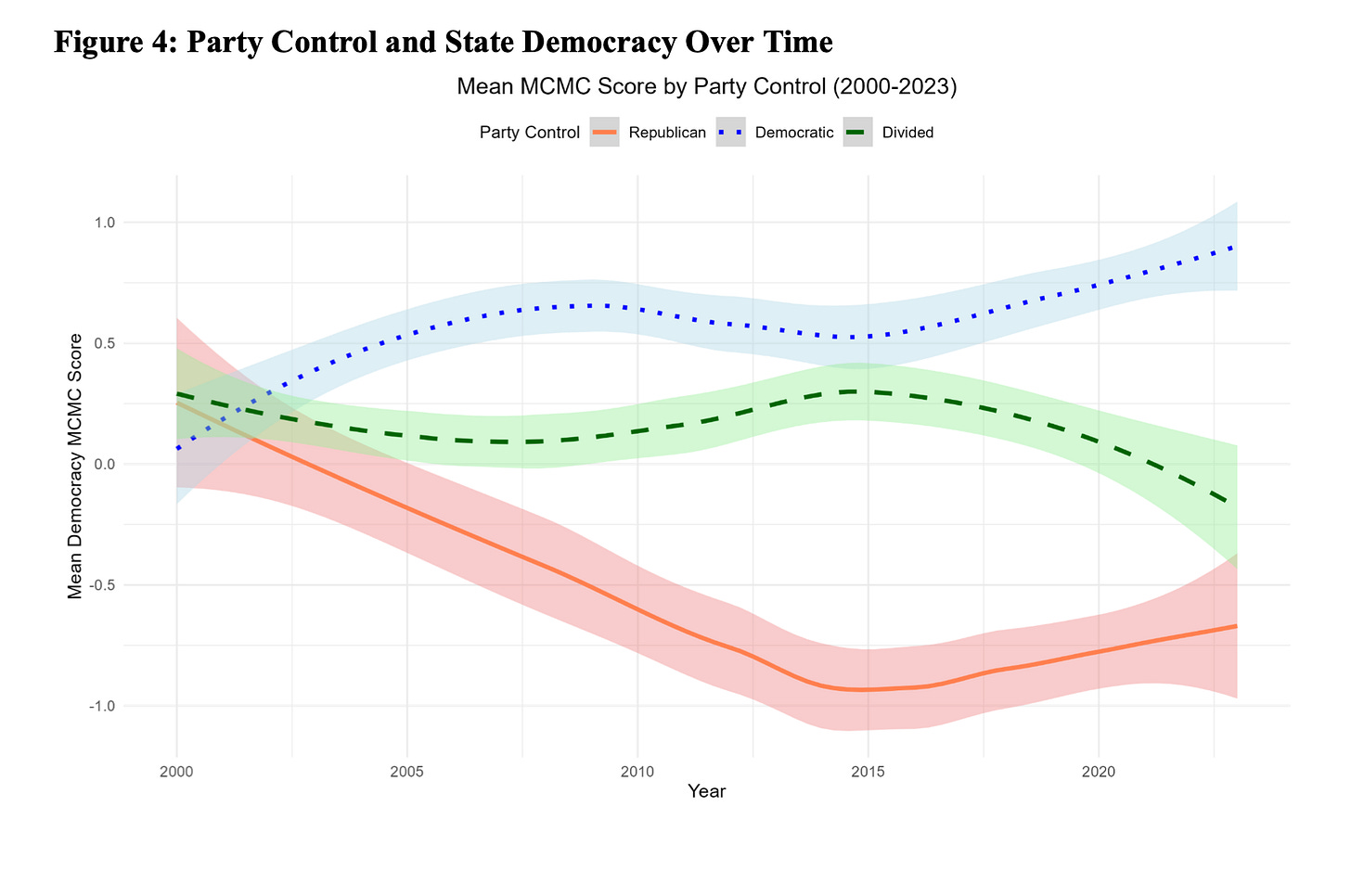 Of course, there is a pronounced partisan asymmetry in this doom loop. Republicans are responsible for a much higher share — almost all — of the degradation of our democracy and the Constitutional rule of law. Since 2000, the quality of our democracy has fallen off a cliff in Republican-leaning states: