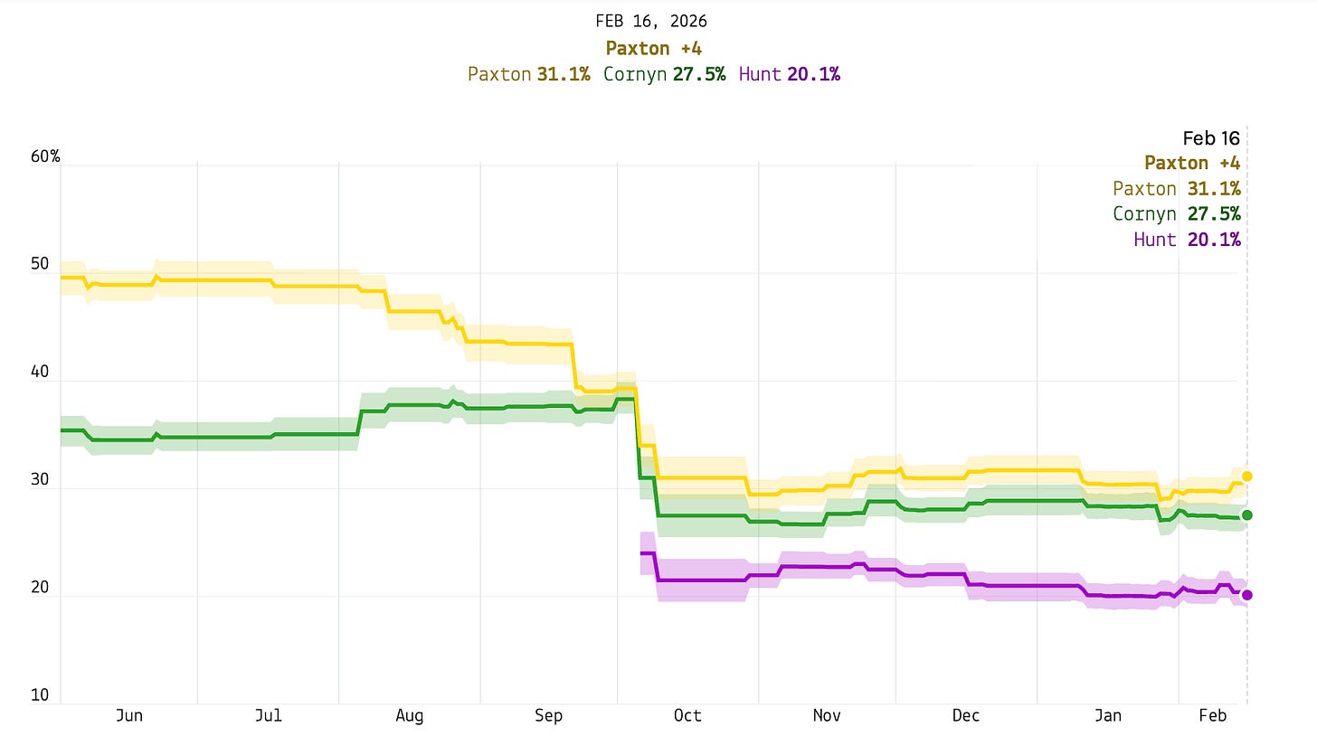 With Texas’s March 3 U.S. Senate primaries fast approaching (early voting starts Feb. 17), we’ve rolled out polling averages for both the Republican and Democratic sides of the race. On the Republican side, it’s shaping up to be a messy three-way race between Ken Paxton, John Cornyn, and Wesley Hunt, with Paxton slightly leading in recent polls. Currently, no candidate is anywhere close to the 50% threshold needed to avoid a May runoff.