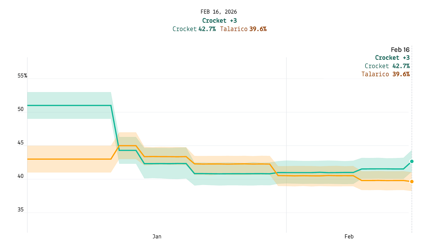 On the Democratic side, Jasmine Crockett and James Talarico are locked in a very competitive battle, with different polls telling very different stories about who’s actually ahead. The uncertainty interval for the average shows we cannot conclude that either candidate has a real lead: