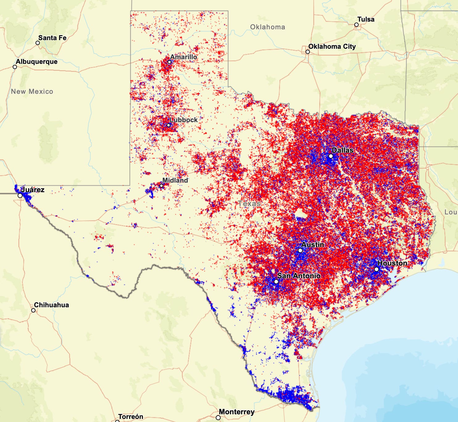 Here's a map of Texas registered voters by their estimated party affiliation, per the voter data company L2: