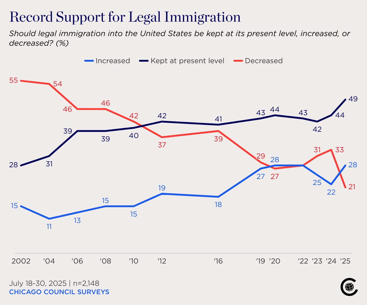 The Chicago Council finds an all-time low in the percentage of U.S. adults who want to decrease the level of immigration into the United States. This is the latest in a series of surveys finding a thermostatic move left on immigration: