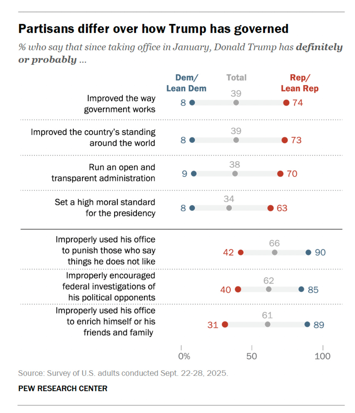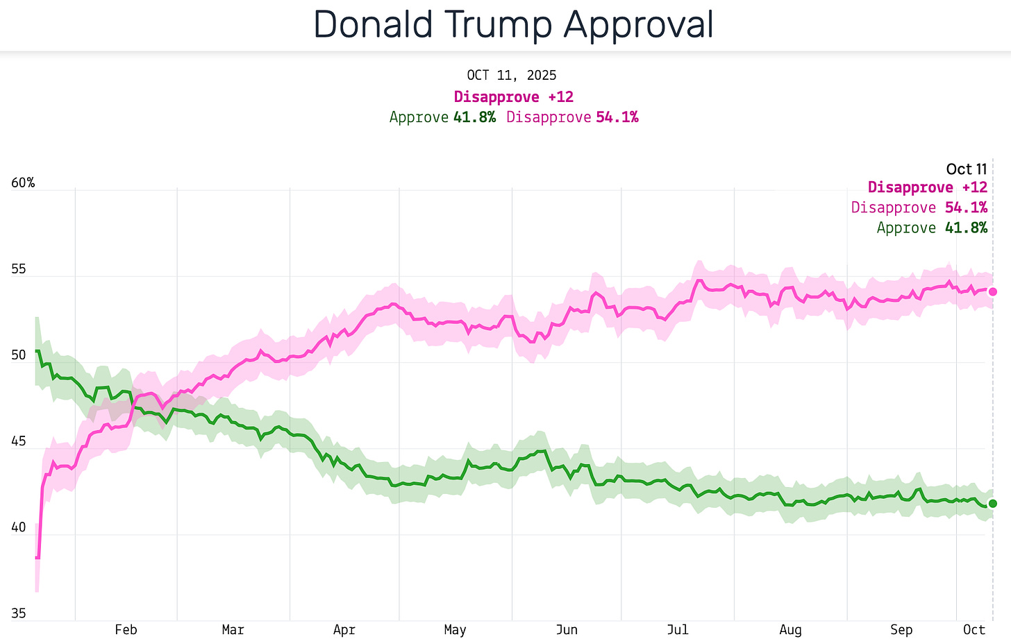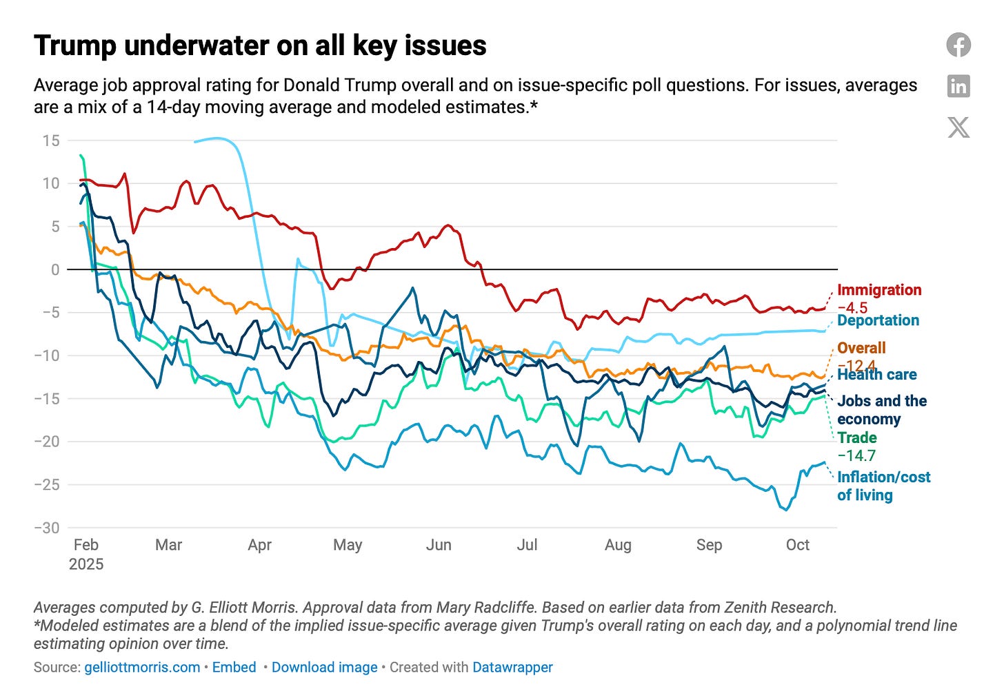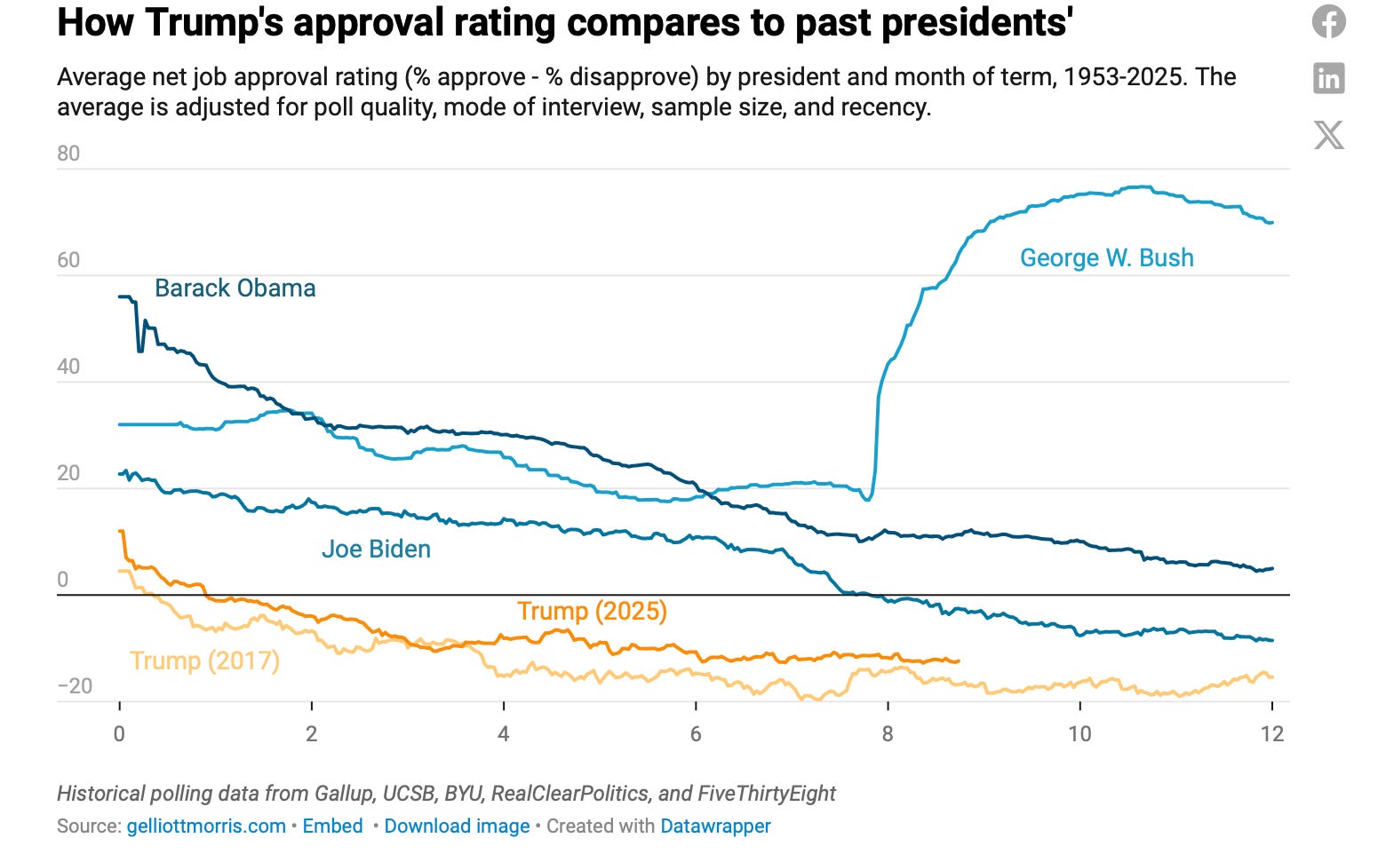 I don’t normally devote the lead slot in this weekly roundup just to disagreeing with someone’s analysis, but I’m going to make an exception this week. U.S. Press Secretary Karoline Leavitt recently shared a clip by CNN’s Chief Data Reporter Harry Enten claiming Trump is “doing what he promised” and “might as well be called Steady Eddie” in the eyes of the public. In other words, Enten is arguing that public opinion about Trump has not changed since 2024, and later implies he could win again if a hypothetical do-over happened today (I have written about this suggestion in the past).