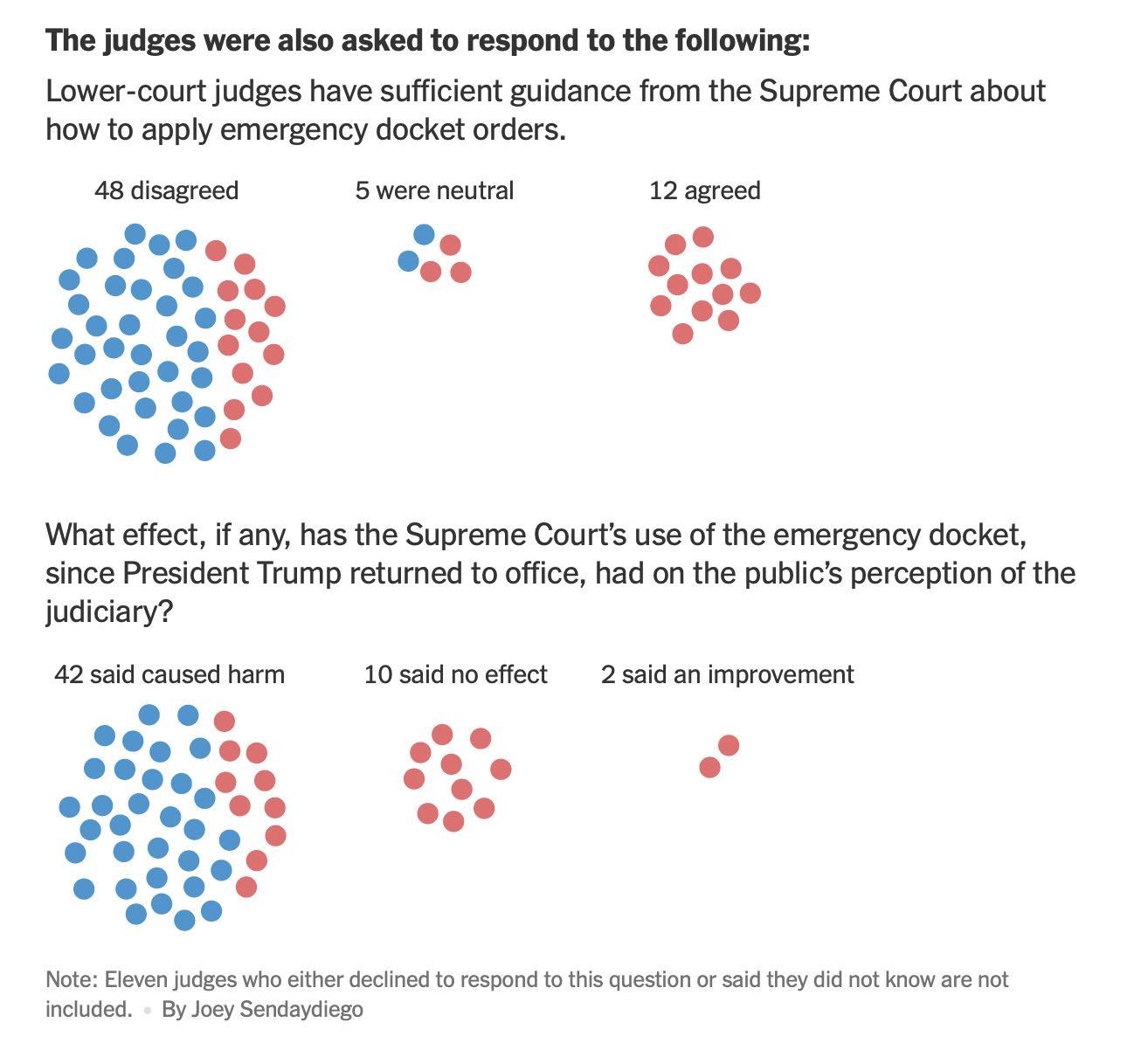 Finally, The New York Times sent a questionnaire to hundreds of federal judges asking about the effect of the Supreme Court’s actions during Trump’s second term. The survey reveals deep worries about SCOTUS’s use of the emergency docket: