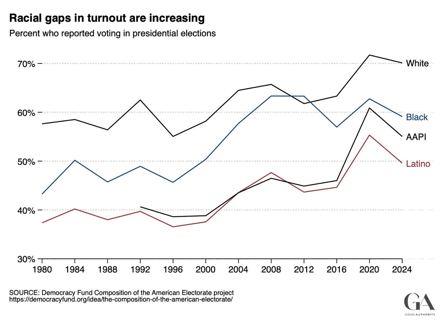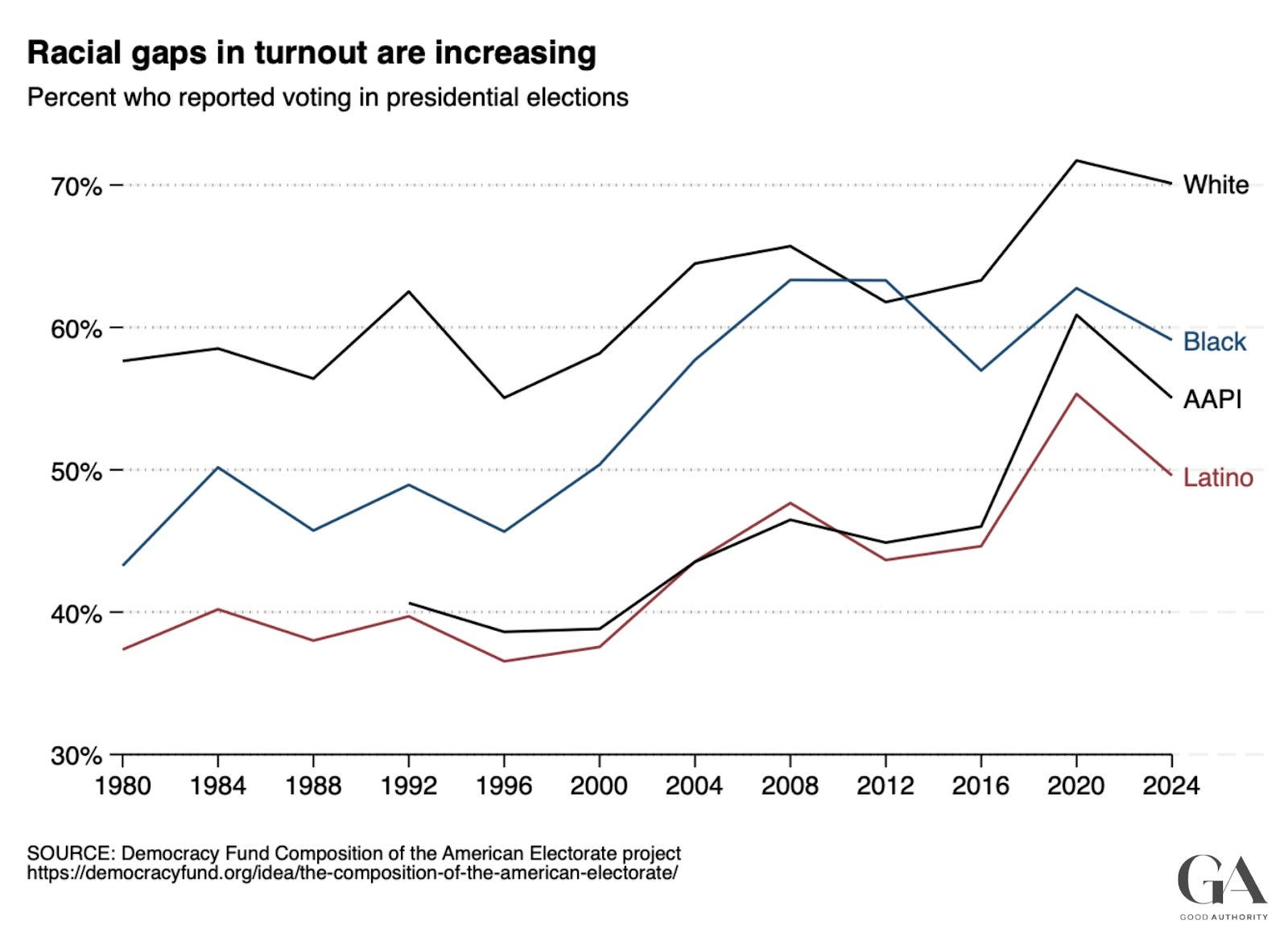 Political scientists Robert Griffin, Chris Warshaw, Devin Caughey, and Bernard Fraga look at voter file and other data and come up with new estimates of turnout among key demographic subgroups. They find that racial difference in turnout grew in 2024: