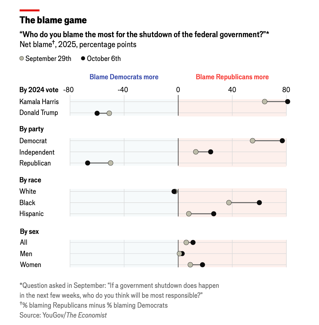 The Economist shows that the percentage of Americans overall, and political independents, who blame Republicans more for the shutdown has risen over the last 2 weeks: