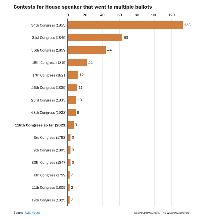 The website of the United States House of Representatives tells me there have been 14 occasions when the election for Speaker of the House has taken multiple ballots. The first was in 1793 — the third Congress ever — when it took members three ballots to cast a majority of ballots for Speaker. Others have taken many more successive votes, such as for the pre-Civil War 34th Congress (meeting for the first time in December 1855). Then, anti-Democratic members won a majority of seats but no single party controlled House due to the disintegration of the Whigs. Some of those members became Republicans, others took up with the Know-Nothings. It took two months, 133 ballots and a rules change to elect the Speaker via plurality to resolve the impasse.