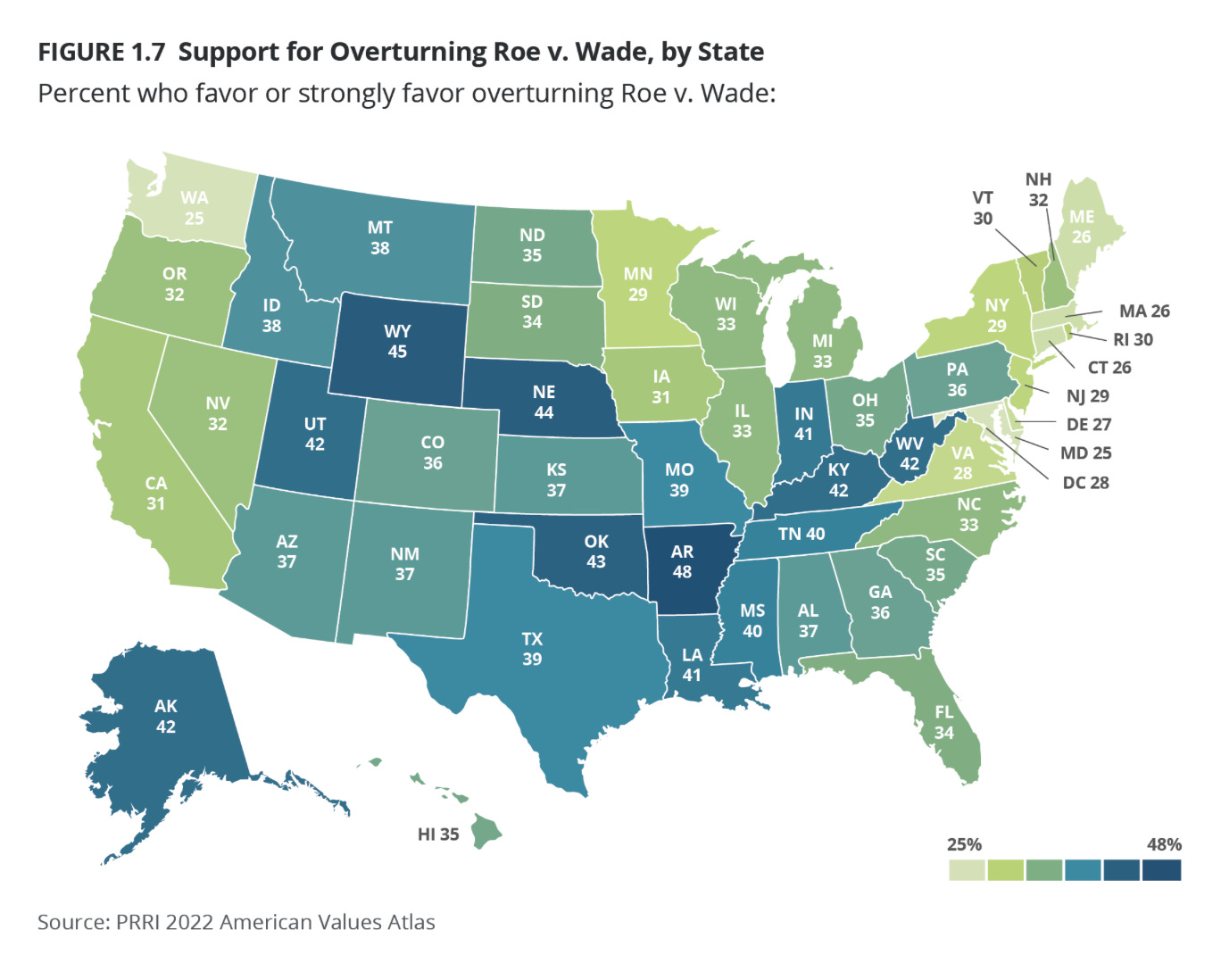 PRRI’s massive survey also lets researchers break support for abortion down by state. They write: