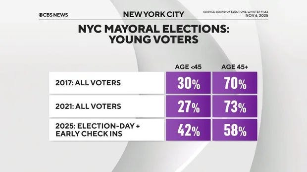 Data from the New York City Board of Elections indicates that of the two million voters who cast ballots in person, 42% were under age 45 — a much higher share than in recent mayoral races. In 2021, just 27% of those who voted for New York City mayor were under 45.