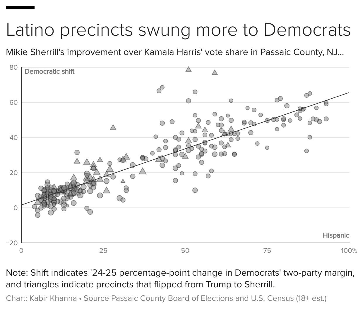 Driving Democrats’ big victories in the 2025 elections on Tuesday were lots of big swings. Latino-heavy precincts moved ~60 points to the Democrats since 2024. Voters from families making less than $50,000 per year also lurched left. Exit polls suggest higher-than-average movement among Asian voters and women, too.