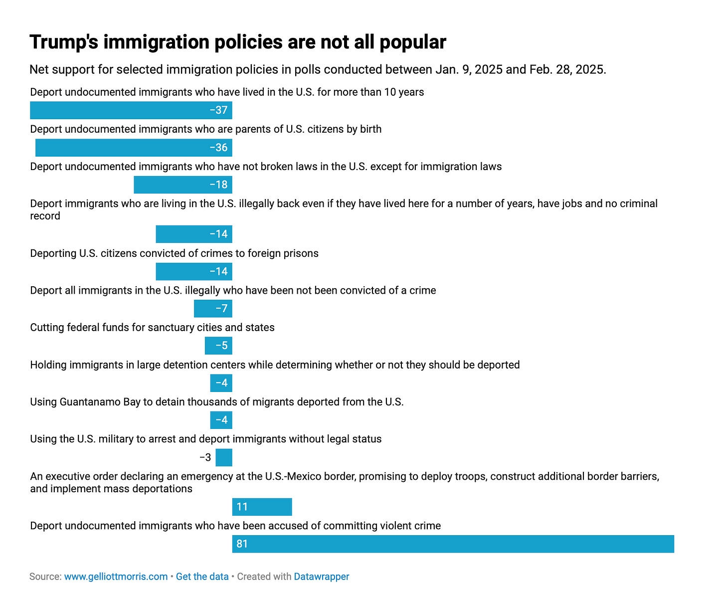 And according to polls, most Americans do not support deporting people like Carol either. Deporting undocumented immigrants who are parents of U.S. citizens is underwater by 36 percentage points, for example, and by a net-18-point margin adults oppose deporting immigrants who have not committed crimes other than unlawful entry/overstaying their visa/etc. The only super popular component of Trump’s immigration policy is deporting undocumented immigrants who have committed other violent crimes.