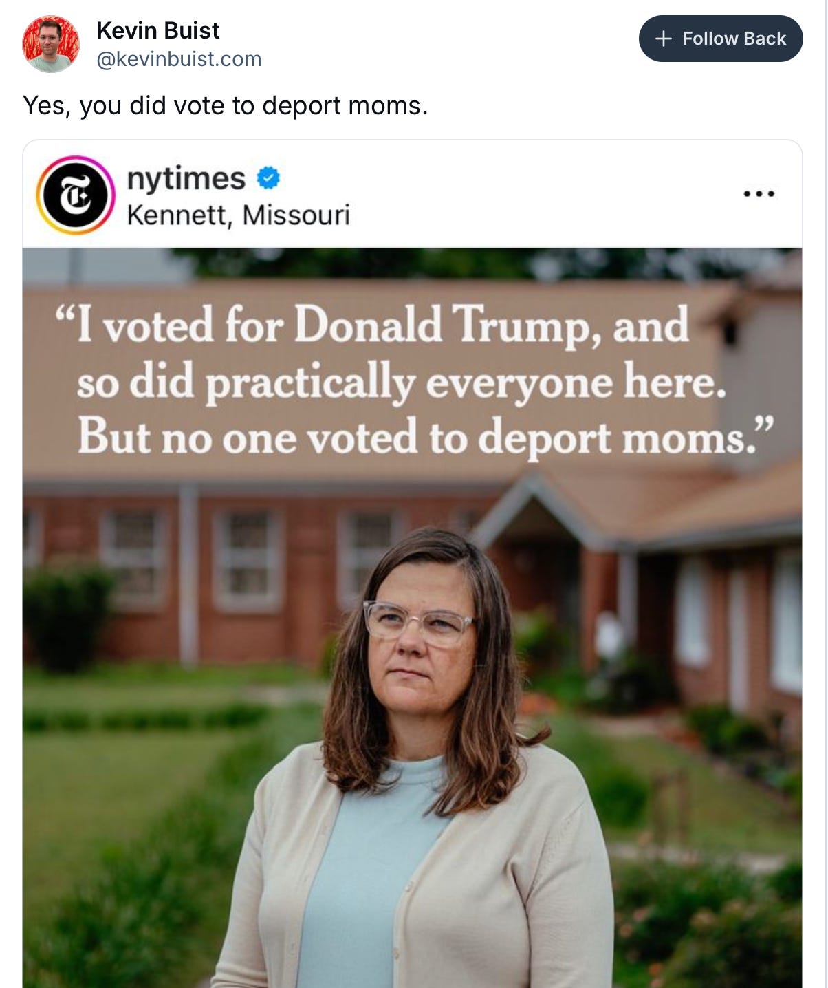 The article is full of quotes from people around the small town (10,000 people — 3x bigger than where I grew up!) saying they do not support what is happening to Carol. That includes people who worked with her, people from her church, and farmers from the county surrounding the town. It seems many of Kennett’s Trump voters do not support deporting people like Carol.