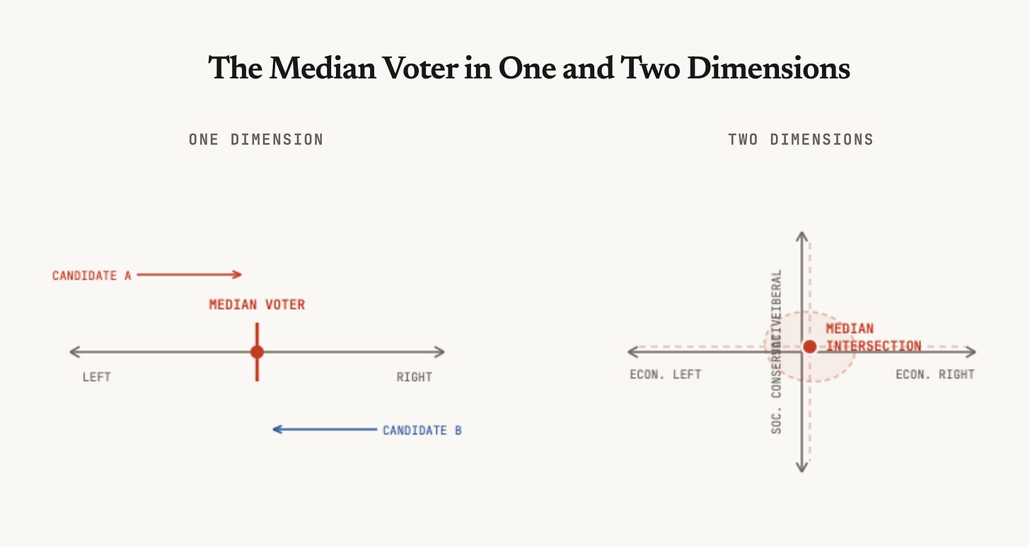 Many analysts expand the MVT to include multiple axes, or “dimensions,” of ideology. Instead of a flat line running from “left” to “right,” for example, you could say someone has different beliefs on “economic” and “social” issues. Winning then becomes a game of correct positioning on multiple policy domains — maybe the median voter is an economic liberal and social conservative.