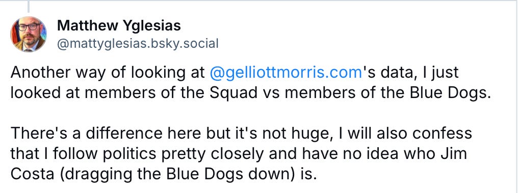 One way that people commonly try to attach value to a number like WAR/P is to see if ideological moderates outperform progressives. This is something of a hot topic in the Democratic Party strategy discourse right now1, and was a subject of some academics-vs-consultants debate earlier this year. For example, here's blogger Matthew Yglesias (firmly in the moderation camp) using our WAR/P metric to make the case for electing moderates: