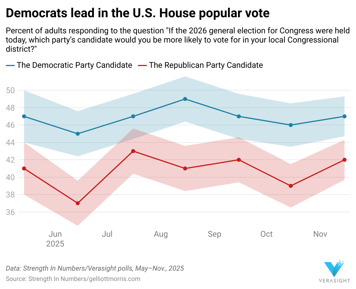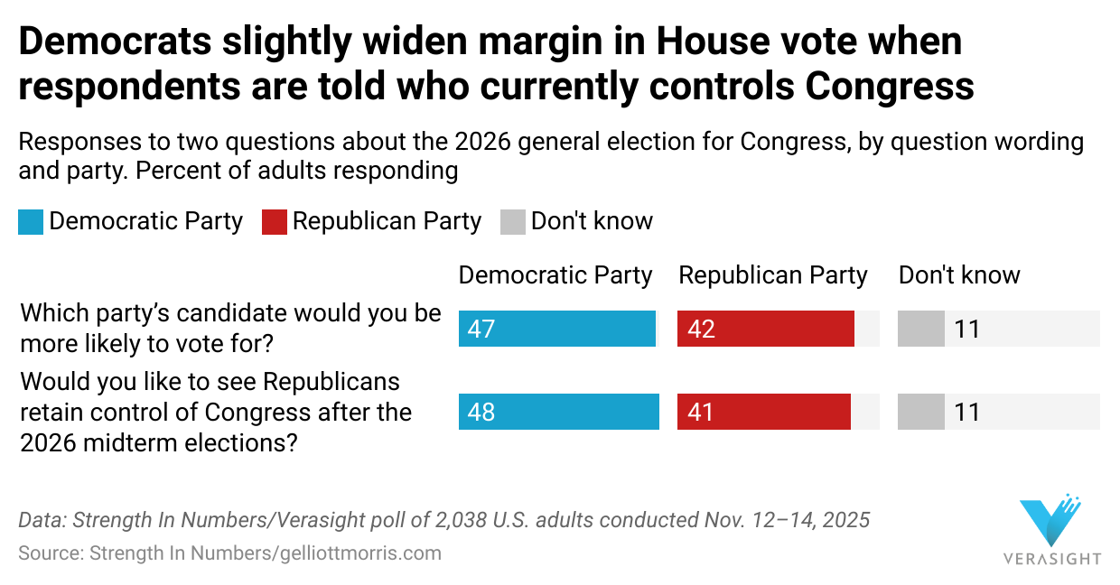 Our new November Strength in Numbers/Verasight poll finds Democrats leading the 2026 U.S. House generic ballot, 47% to 42% for Republicans. In a survey experiment, when respondents are told Republicans currently control the House and Senate, preference for Democrats rises to 48% vs 41% for Republicans — an expanded margin of D+7.