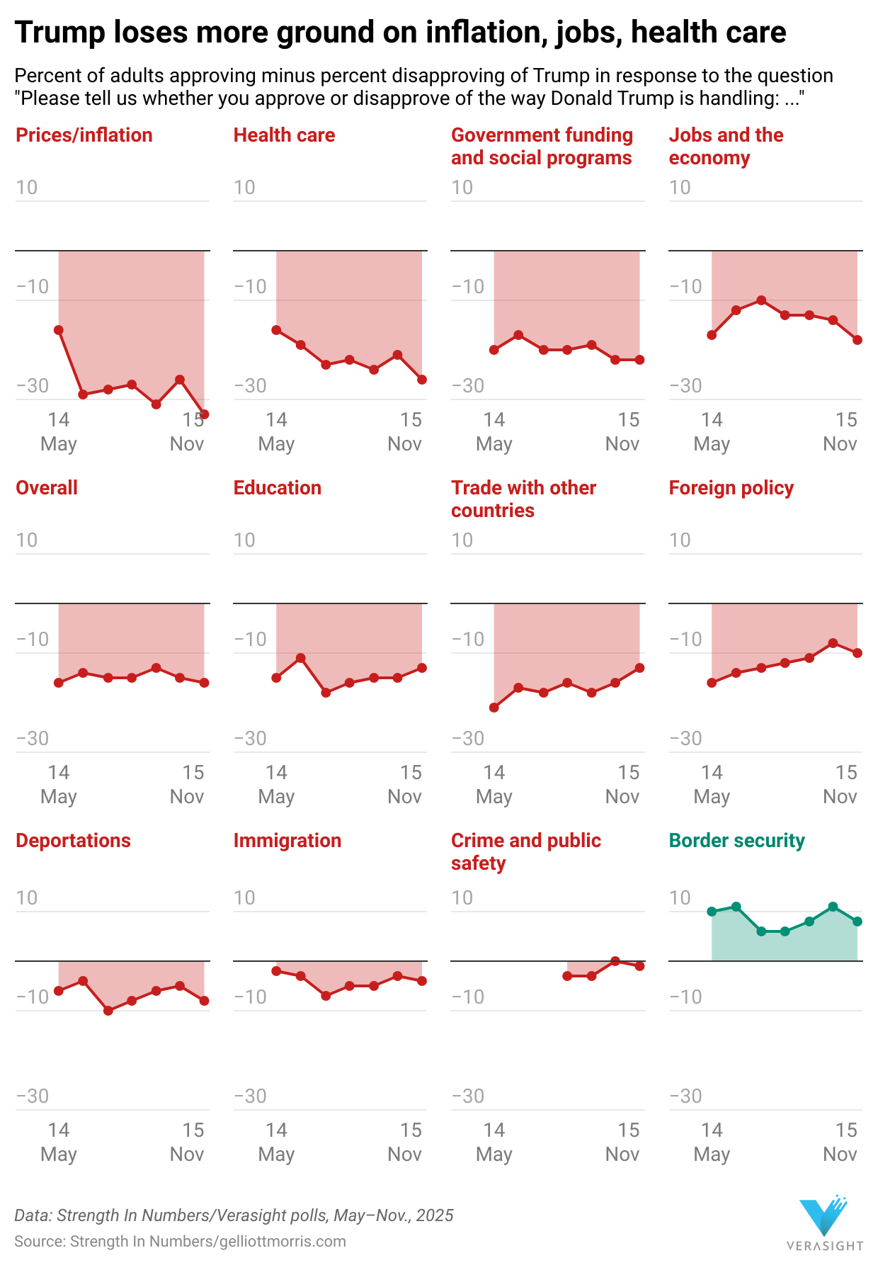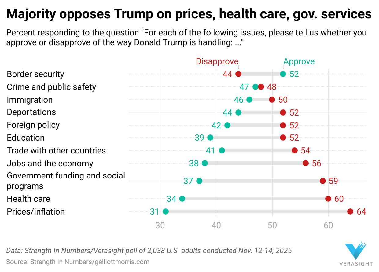 In our November poll, an all-time high of 64% of adults say they disapprove of the job Donald Trump is doing on prices and inflation — a key issue in this month’s elections that saw Democrats sweep statewide races in Virginia, New Jersey, Georgia, and Pennsylvania. A majority of Americans disapprove of how the president is handling every major issue we polled, with the exceptions of crime and border security — the latter of which is the only issue Trump has a net positive rating on.