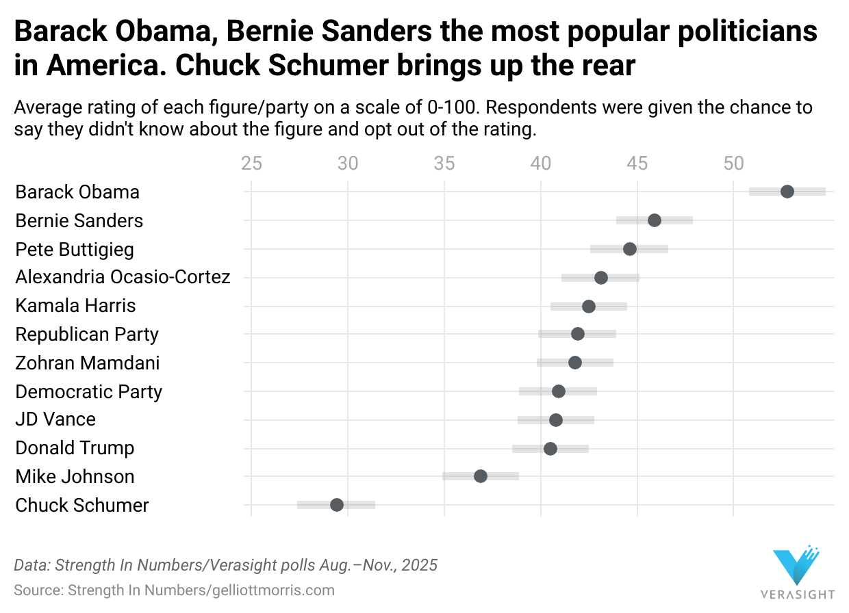 Methodology note: Verasight conducted this poll among 2,038 U.S. adult residents from November 12-14, 2025. It has a margin of sampling error of 2.3%. The survey was weighted to match the political and demographic characteristics of the U.S. adult population according to the U.S. Census Current Population Survey, as well as recent benchmarks for partisanship and past vote from official election results and the Pew Research Center.