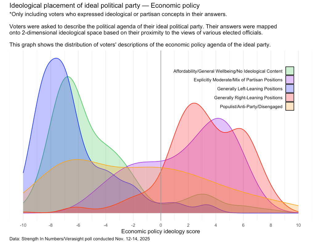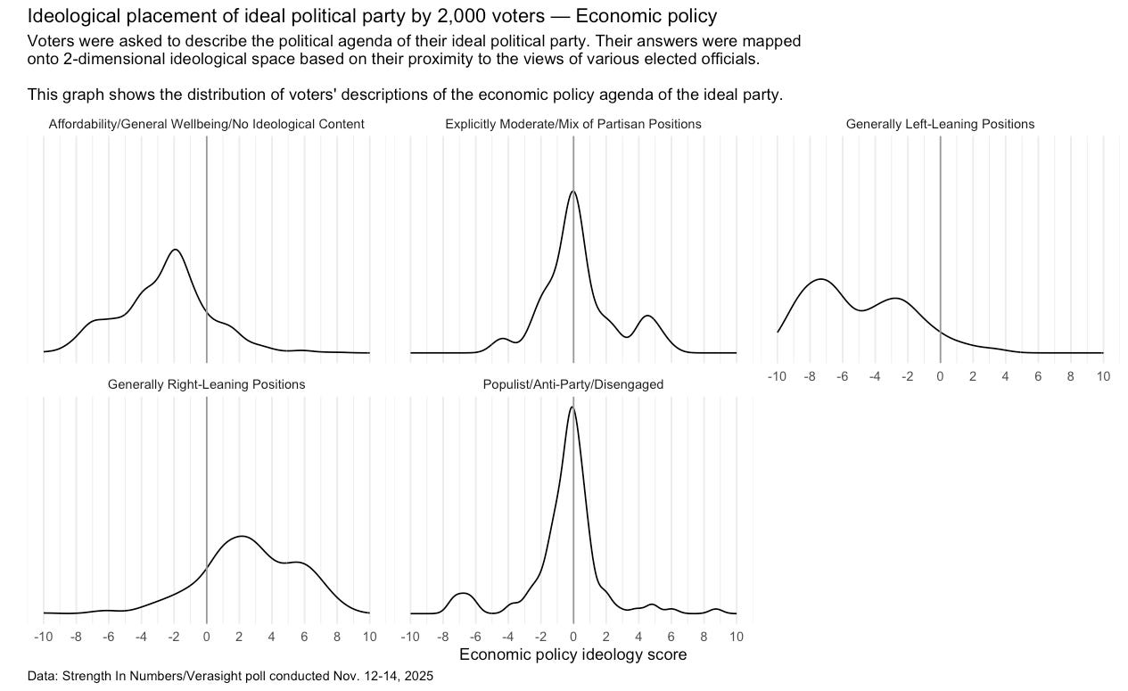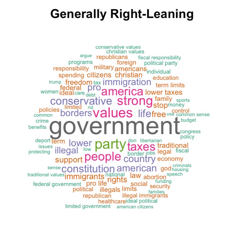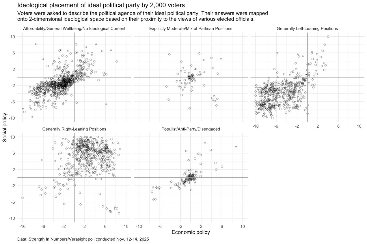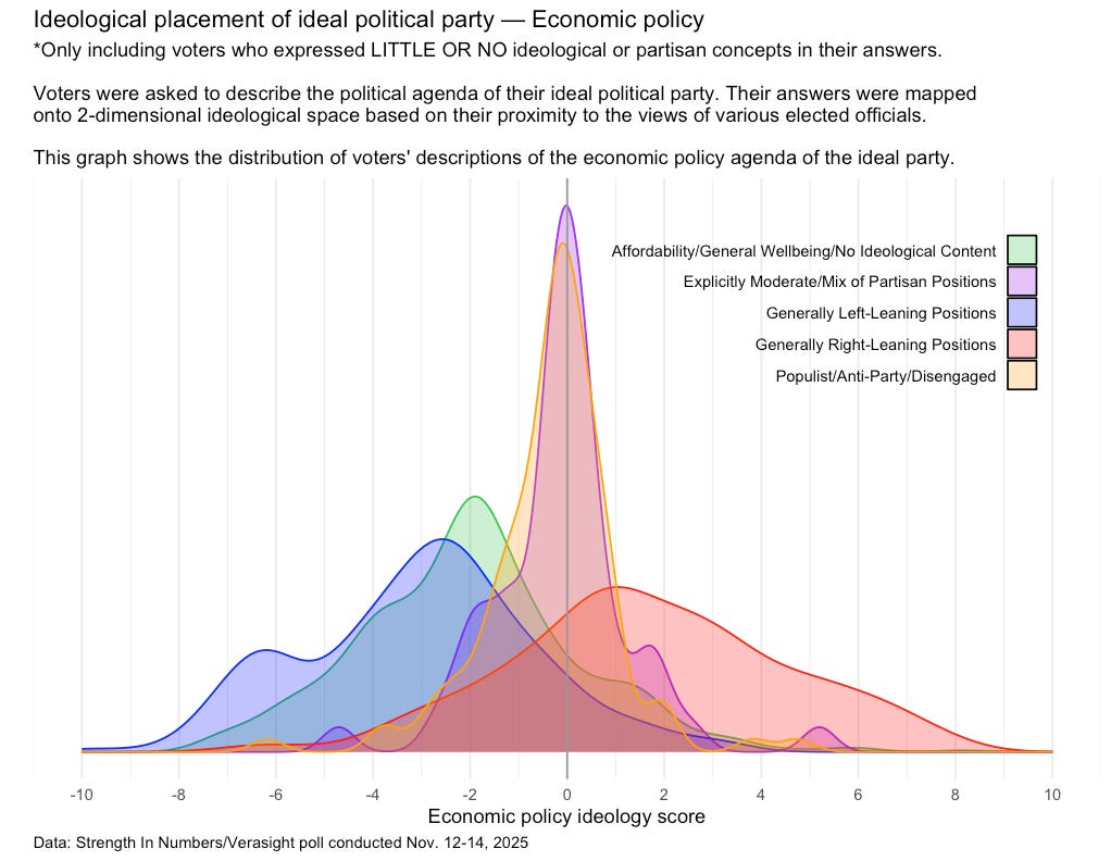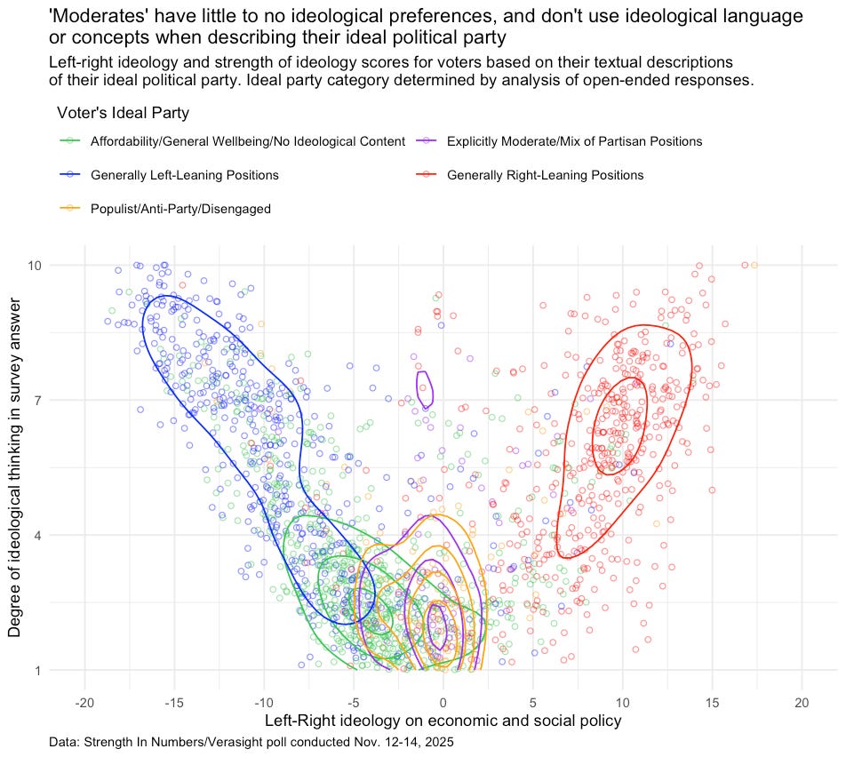 Note that the groups of voters I identified as citing non-ideological issues related to affordability and general wellbeing are also given low “strength of ideology” scores by the LLM. By and large, so are the populists and moderates.