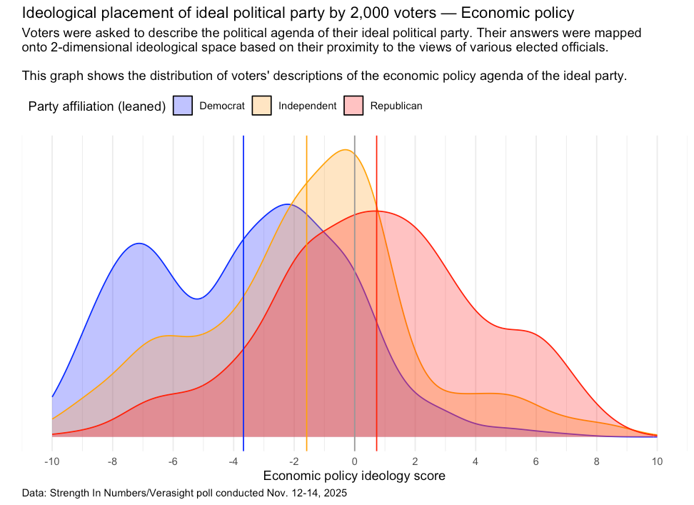 This is especially true for non-partisans and independents. Particularly on economic policy, respondents to our survey who either did not affiliate themselves with a political party OR whose surveys answers indicated their ideal party would prioritize affordability/general wellbeing over other ideological issues landed closer on the ideological spectrum to territory we typically associate with the Democratic Party than the Republican Party.