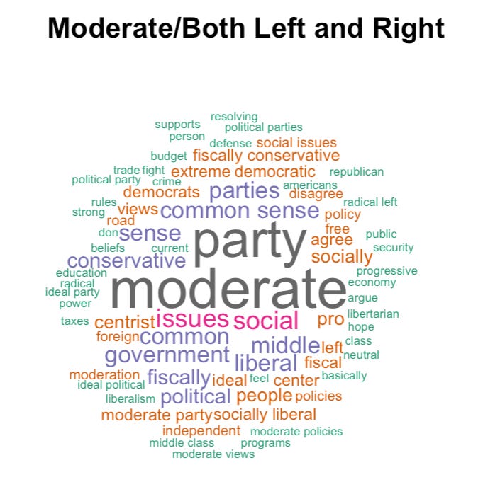 Finally, the explicitly moderate group expresses support for a party that lives in the true political center. These respondents describe a “purple” and “centrist” party that avoids extremes, taking “the best parts from both left and right.” In our formulation, someone is a moderate either by using the word moderate (or a similar word) in their answer, or by describing a moderate party with issues taken from both sides.