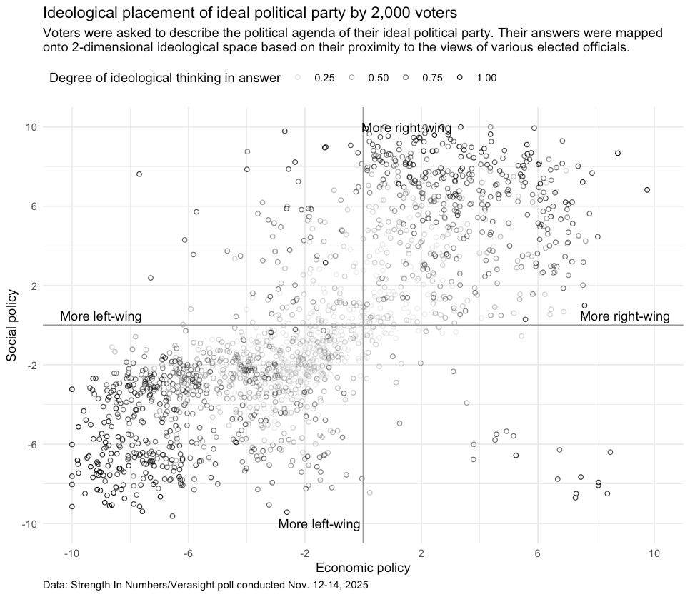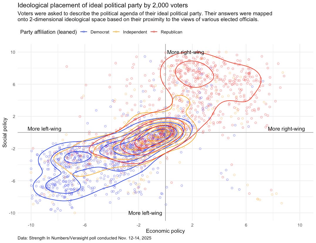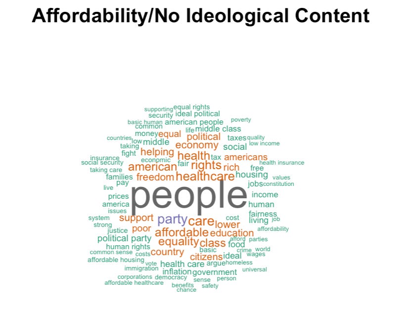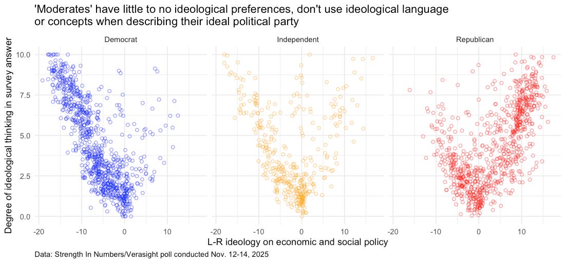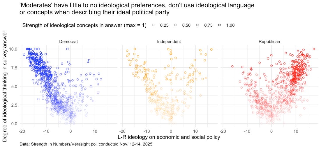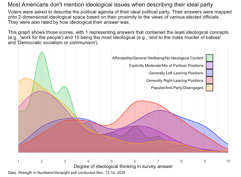 This article is in front of the Strength In Numbers paywall because I want it impact the way the public thinks about ideology and voter behavior. Specifically, the omission of any concept of ideological strength from most practitioner analysis on this subject makes it look like everyone, but especially political moderates, has a coherent mental model of politics and what parties stand for. But our data suggest that most Americans do not reference ideological issues when describing their ideal political party. Instead, most reference kitchen-table issues and general values about politics and society.