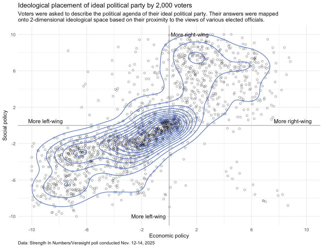 In the chart below, I have placed every respondent to our survey somewhere on the plot based on the ideological position of the ideal party they described in their survey answer. Each person’s ideal party was given an ideological rating on both economic and social policy, so that this chart would be comparable to other popular approaches for analyzing voter ideology. The contour lines on this chart are drawn computationally to highlight the density of points on the plot (most voters occupy the center or center-left).