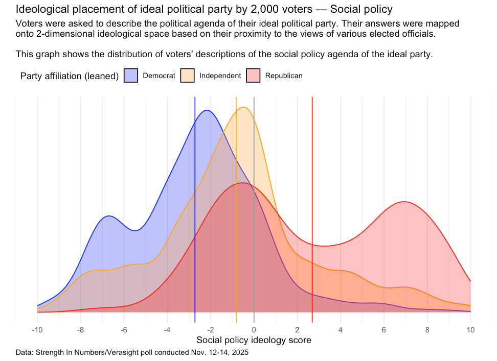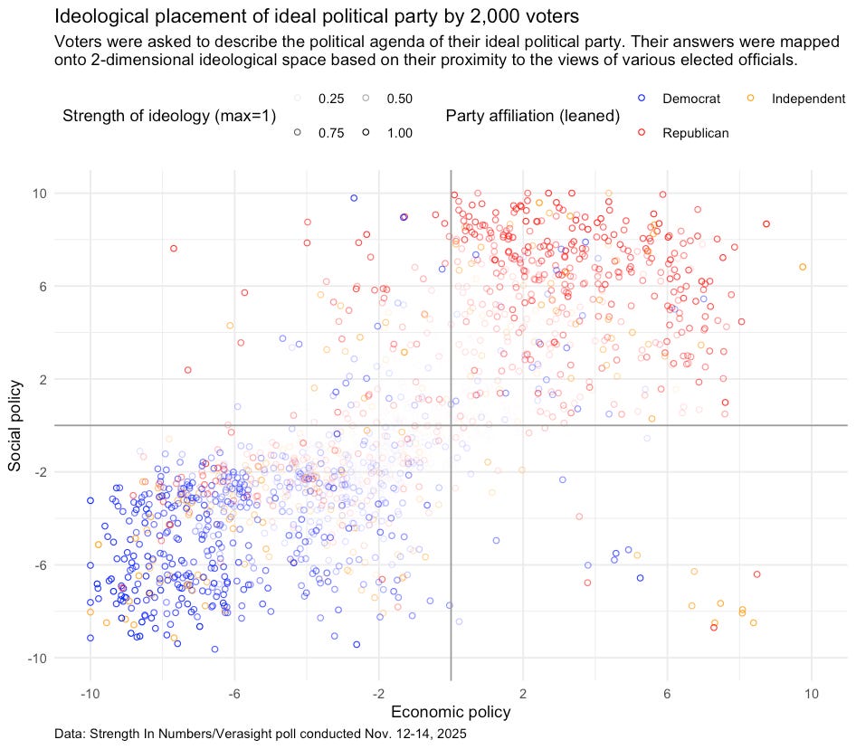 Observe how Democrats mostly describe a left-leaning “ideal party,” Republicans describe a right-wing one, and independents range the ideological spectrum but are tightly clustered in the middle.
