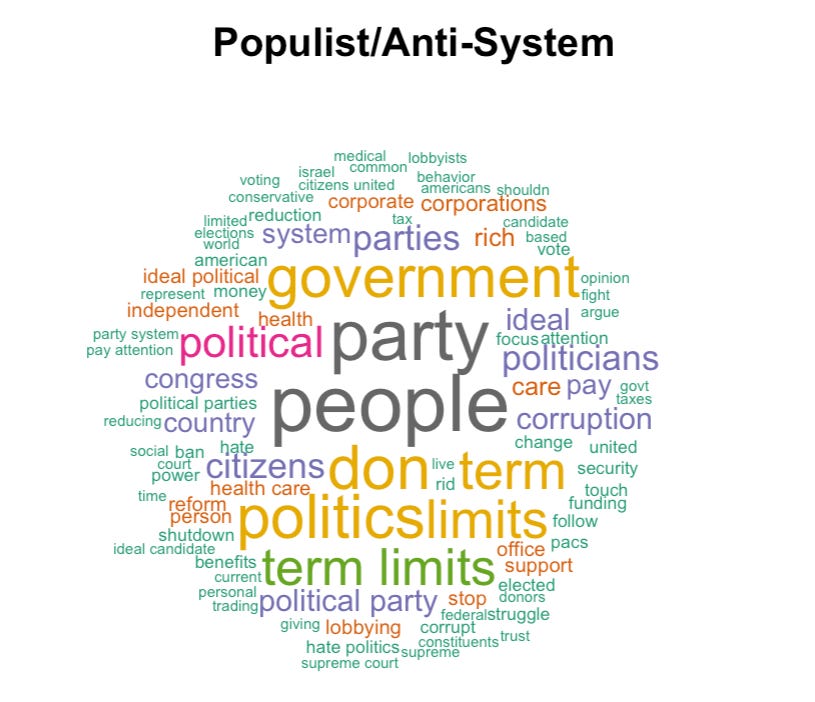 From there, I categorized remaining voters based on the ideological lean of their answers and the anti-elite/anti-system sentiment expressed in their responses. While many voters mentioned clearly ideological positions such as “MAGA” and “strong borders,” or “Public healthcare for all at no cost” and “End of capitalism,” still others used anti-elite or populist language like “Professional Govt has got to GO! They are useless and have no concept of the American struggle.” Respondents were put in a right-wing (26% of the sample), left-wing (26%), or generally populist bucket (6%), respectively, if they included language similar to that above. Voters who expressed anti-system or anti-party attitudes (one person said “My ideal system would have no parties”) were also placed in the bucket with populists.