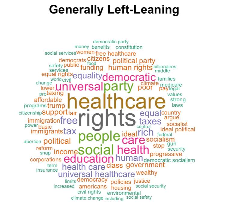 Many people in the Left-Leaning Party also support progressive taxation and redistribution, explicitly calling for higher taxes on the wealthy or “taxing the rich” to pay for education, healthcare, housing, and other services. Climate and the environment show up as well, usually in the form of calls for climate action and investment in renewables.