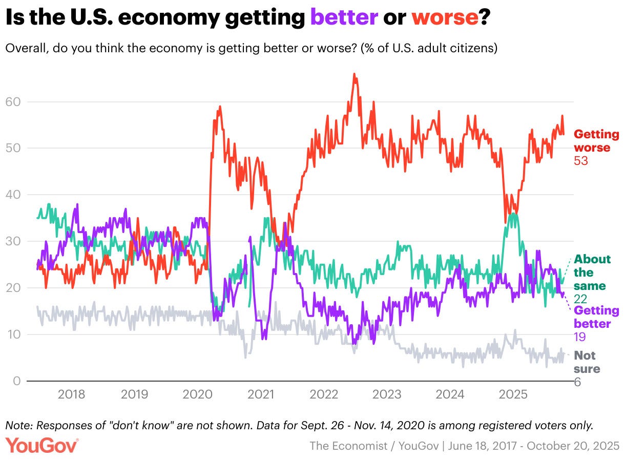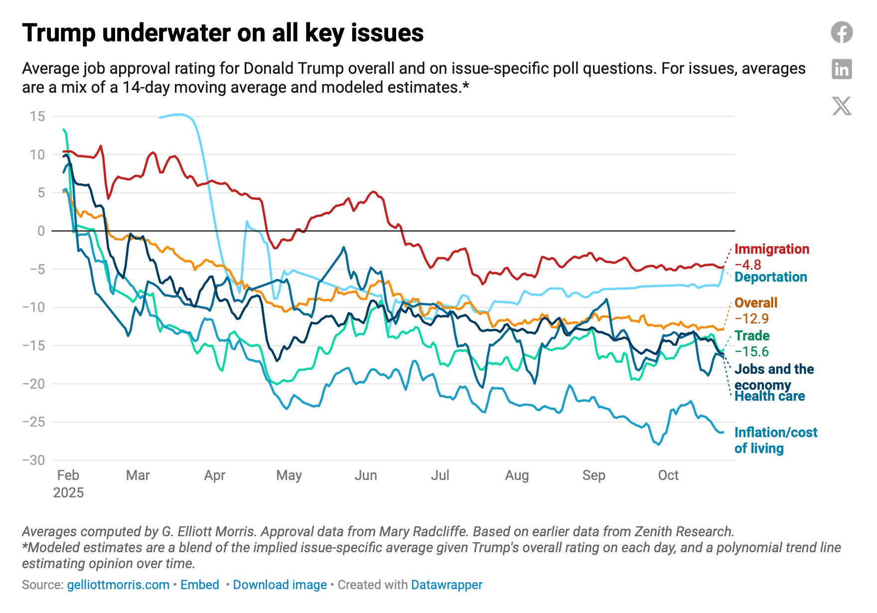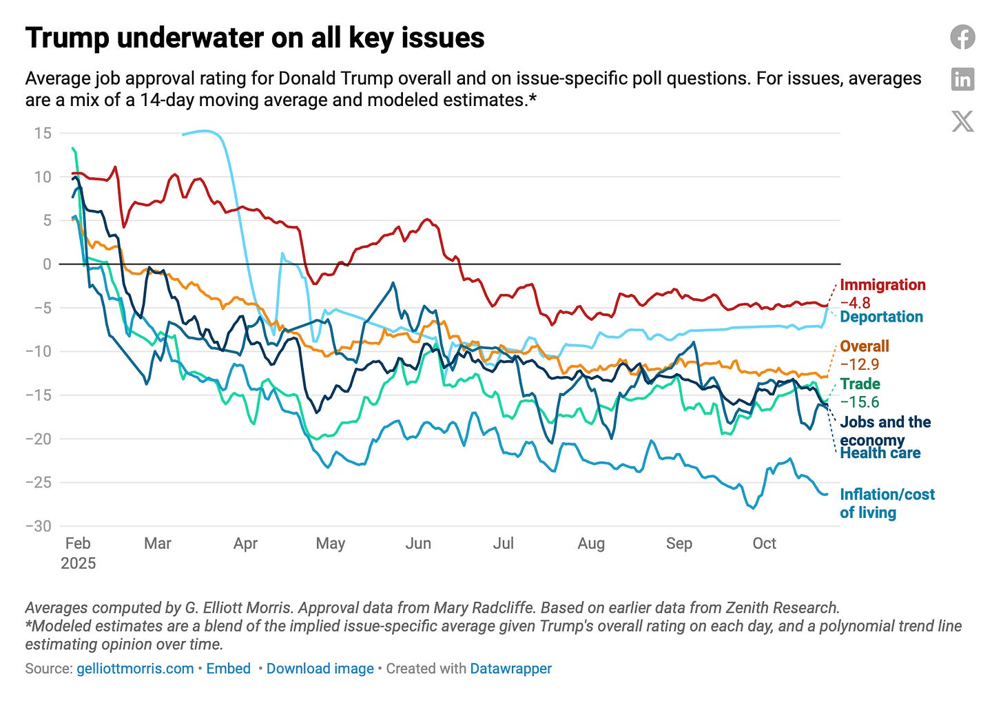 If you viewed Trump’s 2024 victory not as the product of some inherent, long-term advantage for Republicans on the economy, but as a reflection of broader anti-incumbent sentiment and general dissatisfaction with the direction of the country, it was easy to anticipate how Trump’s tariffs and rising prices were going to turn around and hurt Republicans in the 2025 and 2026 elections. Need I mention that Trump’s approval on inflation and the economy is now approaching new lows, according to our tracking:
