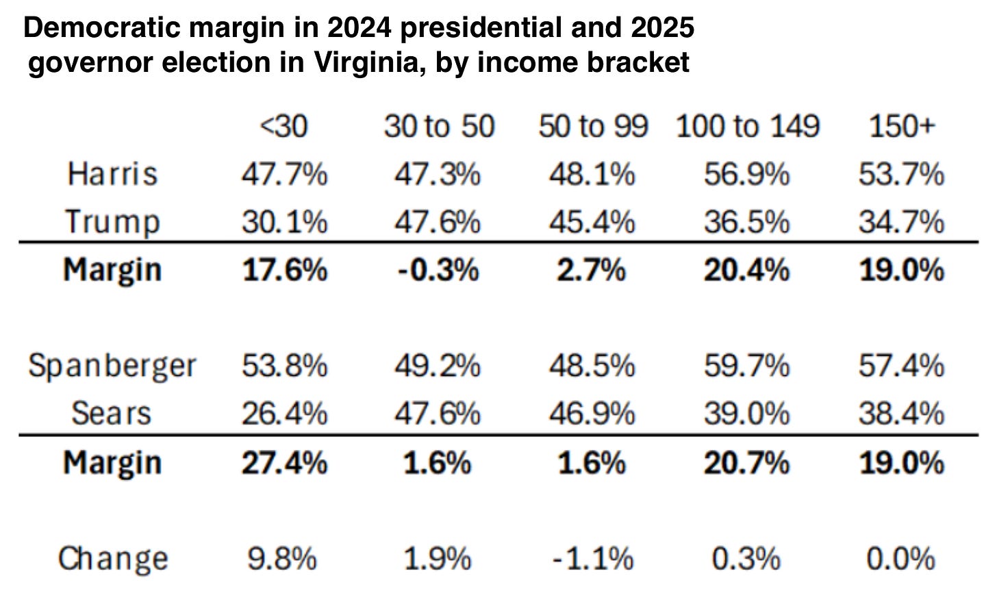 Statewide election polling, however, shows the same pattern of a broad shift to Democrats on the economy. The result of this 2025 Virginia election poll from State Navigate, a non-profit, is the case in point. The screenshot below shows recalled 2024 vote margin and 2025 governor margin for different groups of voters based on their income, with each column showing results for a different income bracket. Voters making less than $30,000 per year, according to this poll, recalled voting for Harris by 17; those making $150,000 or more voted for her by 19.