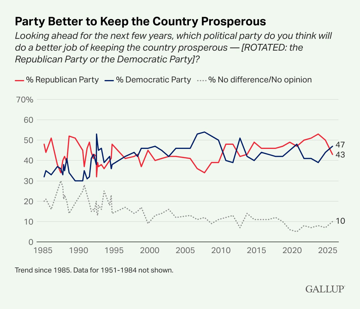 Since 2024, I’ve been arguing that inflation and the economy are not a Republican issue, but an anti-incumbent issue. This take is consistent with most of the historical political science literature and current polling data. The literature says voters punish the party in power when the economy contracts or prices go up, and reward them when prices go down or the economy expands; as the party in power has changed while inflation has resurged, the party “benefiting” from inflation has changed.
