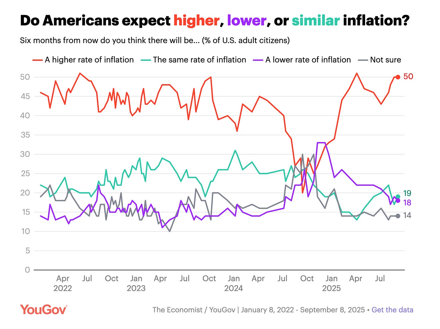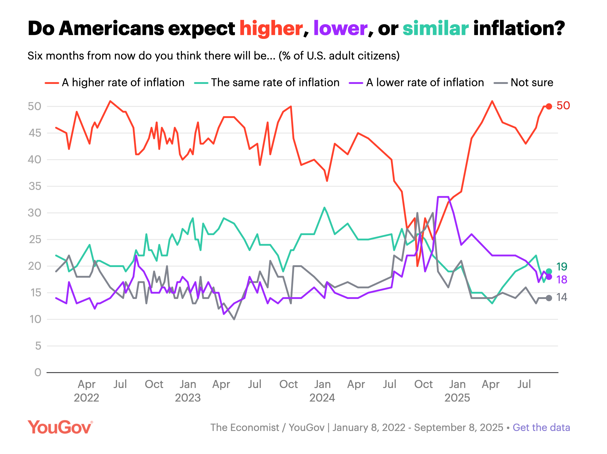 Additionally, 50% of voters expect a higher rate of inflation next year, matching the high points in 2022-2023. The share of voters expecting more inflation has doubled (risen 25 percentage points) since Trump won the election in November 2024: