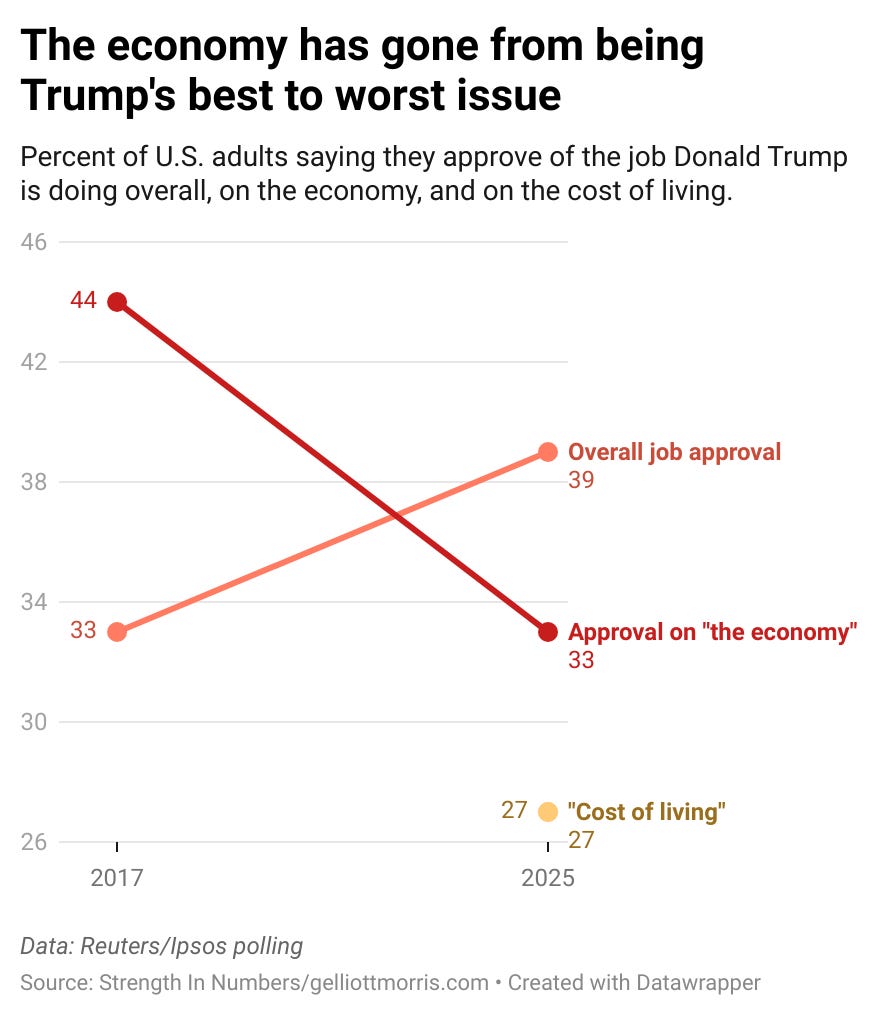 Other recent polls have found the same. While lots of voters in Trump’s first term gave him credit for the economy, even while they didn’t like the rest of his agenda, now the dynamic is flipped. There are a lot of Republicans out there who say they like what Trump is doing on immigration or crime, but not on the economy or cost of living.