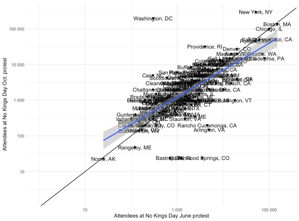 Finally, we can use our data to compare activity in the October and June No Kings events. You can see there was a higher turnout in large cities, especially Washington, DC, New York, and Providence, which helped power the higher turnout in October vs June.