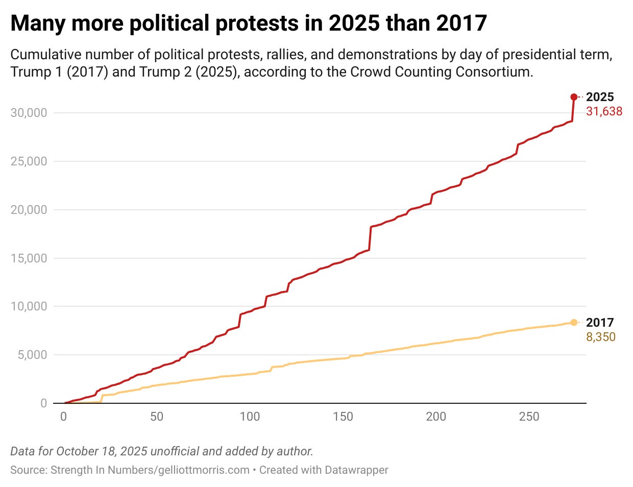 The large jump in political activity is also notable if we look at the number of people attending events. As of Oct. 18, 2025, at 11:00 PM ET, Strength In Numbers estimates at least 12.8 million people, or 3.7% of the population, have demonstrated against the president since he took office: