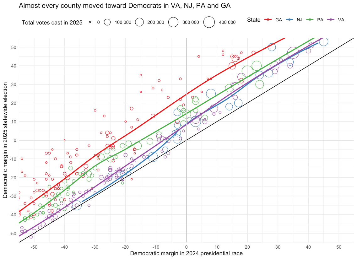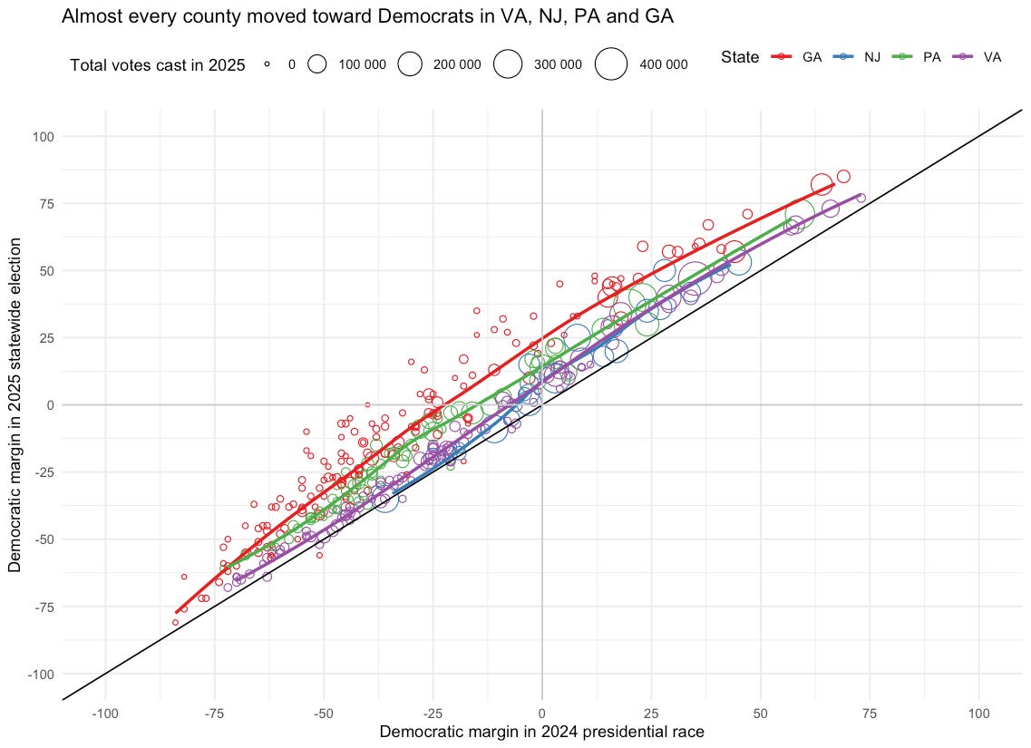 What we saw last night was a directional shift toward Democrats in 99.8% of counties that held partisan elections. With few exceptions, voters everywhere moved to the left from 2024 to 2025.
