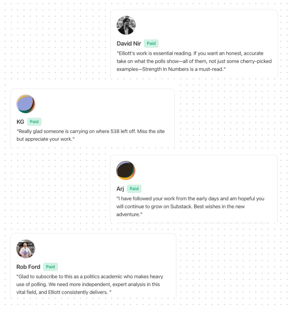 Strength In Numbers is generating enough subscription revenue (after Substack and Stripe take 13%, and the government gets another 30-40%) for me to pay my family’s bills again. The newsletter will probably make about $70,000 after taxes and fees this year, which is enough for me to pay myself and sock some cash away in a business account to invest in other members of the team down the road. I’m hoping to say more about that in the coming weeks. (We are moving the parts of this site that are more of a group effort to a new business entity with other monetization strategies available to us — all in the name of safeguarding fast and accurate poll aggregation for cycles to come. Like I said, more info to come.)