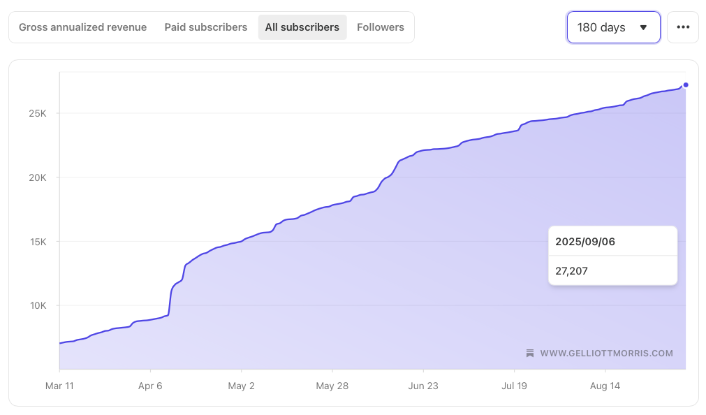 But after some tireless posting through the last six months — and the work of several people behind the scenes to get our polling aggregation infrastructure set up — today, the business is sustainable. Growth is frankly much better than Substack originally projected. Adjusting for a few big jumps in subscriptions when I launched the site in May/June, Strength In Numbers is adding roughly 50 net readers per day: