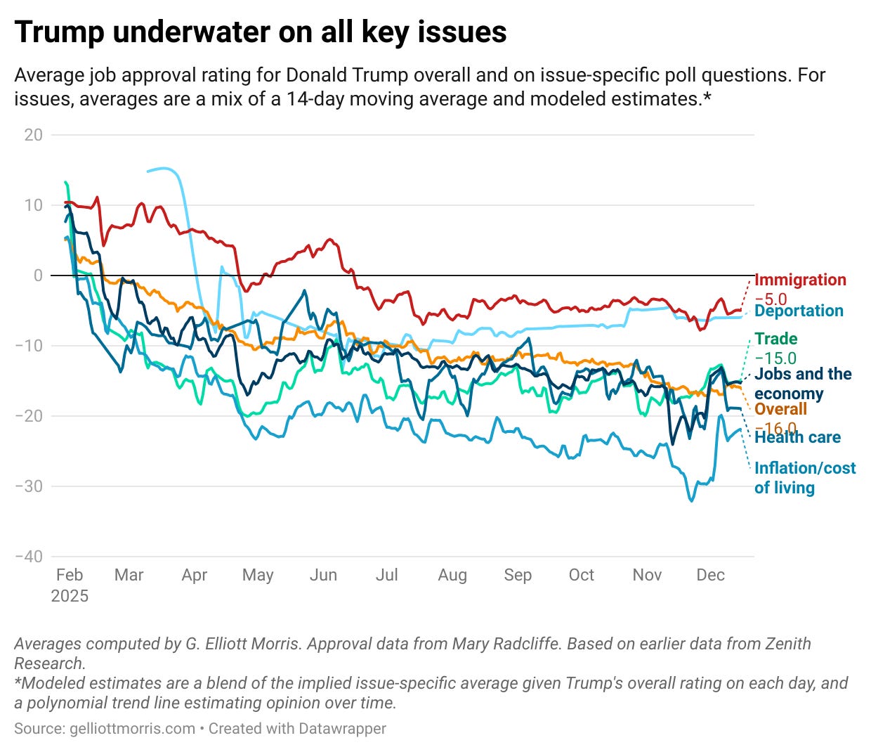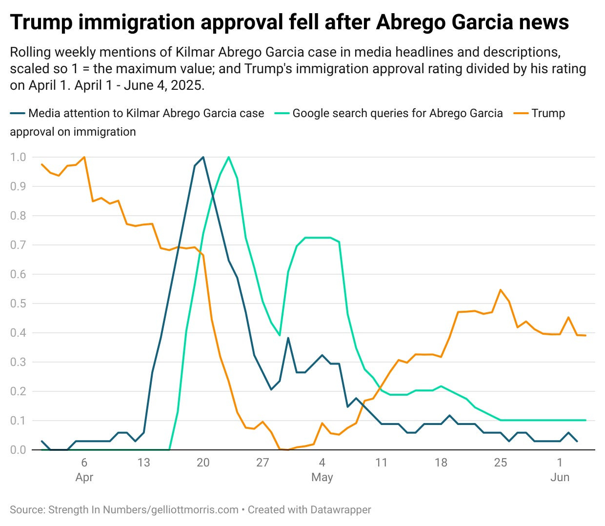 The chart below shows Trump’s approval on immigration and several other issues. When Democrats started calling for Abrego Garcia to be returned in late April, the president’s approval rating on immigration fell off a cliff. Then, when news attention to the subject fell in late May, his approval recovered. It dipped again in mid-June, when the president (again unlawfully) deployed the National Guard to aid with immigration enforcement operations in Los Angeles, and has stayed low since: