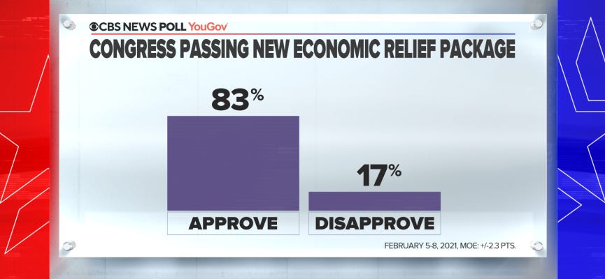 A new CBS News/YouGov poll released earlier this week found that Joe Biden’s economic relief plan is popular with a “broad bipartisan majority” of the American public. I have written before about the popularity of giving people money, but the support numbers for Biden’s/the Democrats’ bill is even more astounding than my expectations. According to CBS, 83% of Americans approve of Congress passing the relief package, while only 17% disapprove.