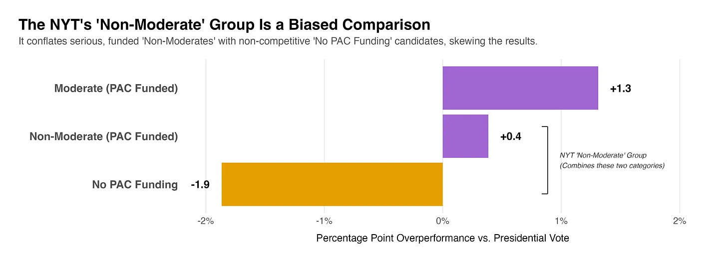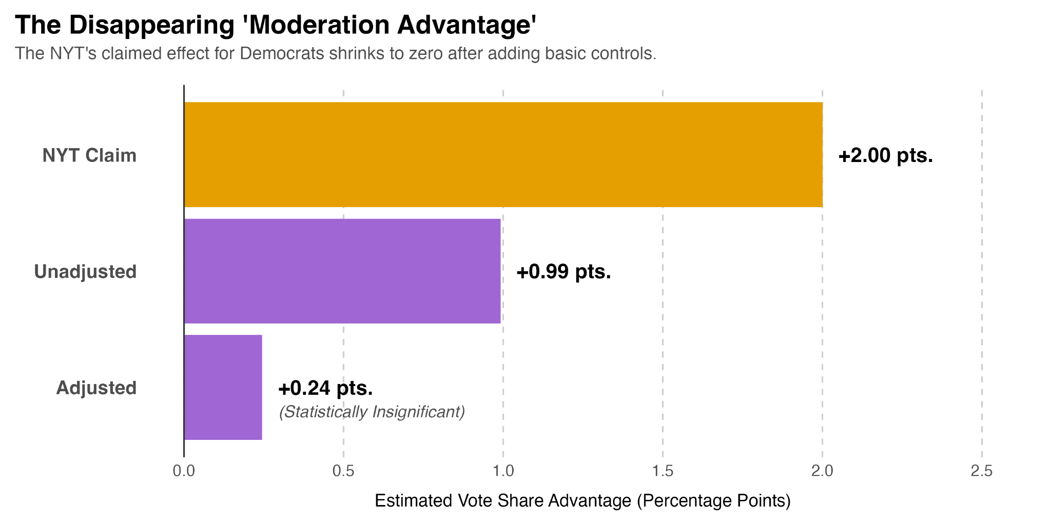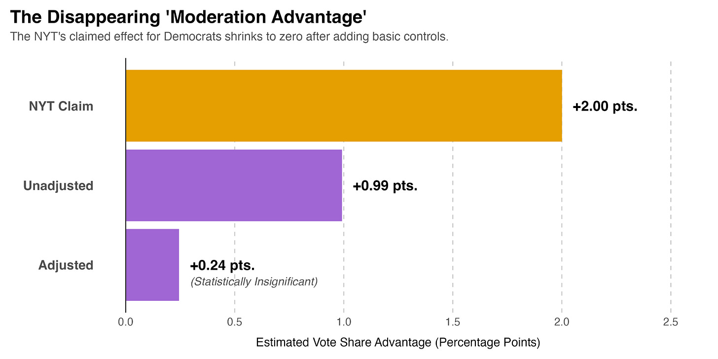 The small electoral bump the Times attributes to moderation isn’t a feature of ideology at all. It’s a phantom effect created by ignoring the two most powerful forces in American elections: fundraising and incumbency. When we apply even the most basic statistical controls, the “moderation advantage” disappears completely.