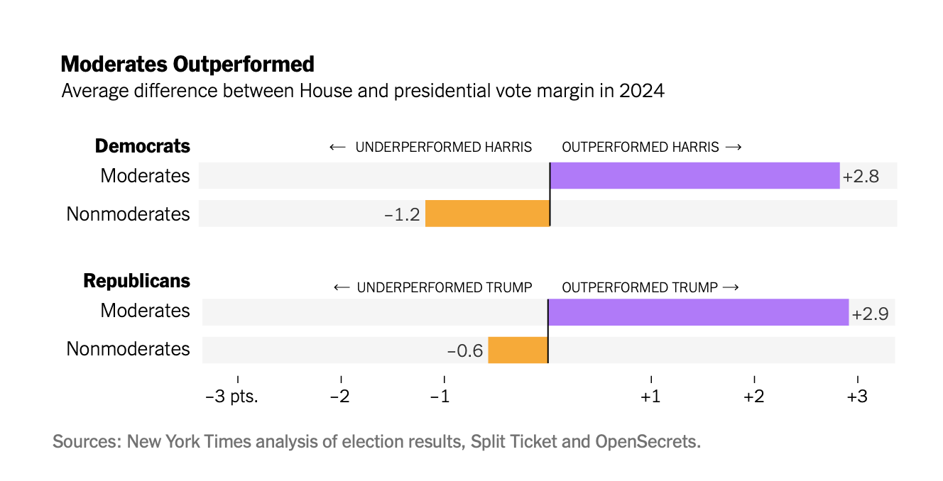 This ignores that other factors, such as incumbency and the amount of money a candidate fundraises, also correlate with a higher candidate vote margin. In 2024, moderates were disproportionately incumbents and had more money thrown at their races, which explains almost all of the Times findings. Bonica writes: