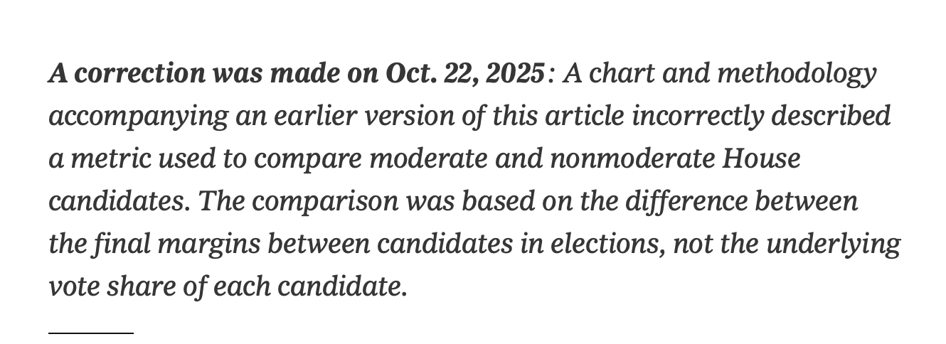This week’s lead note touches on a big New York Times article published on Monday, Oct. 20, in which the paper argues moderate candidates for Congress meaningfully outperform non-moderate candidates (On the order of 4 percentage points). Given that this Substack is devoted to seeing what we can (and cannot!) learn about politics using data, I have a couple of reactions to this piece. The Times also criticizes my own earlier analyses on this topic, so I think it’s only fair that I get a response.