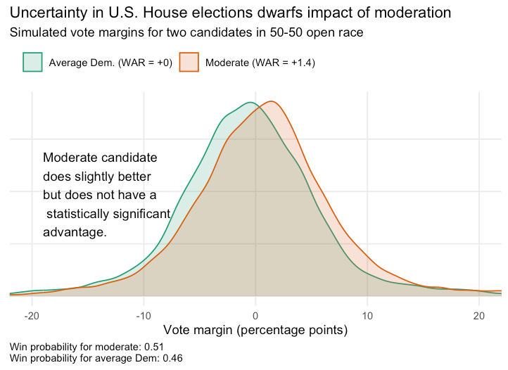 So, how would a real hypothetical play out? We put together a full Bayesian forecasting model for House elections to answer exactly this question. Our result is that the baseline that the Editorial Board and other analysts use is significantly biased toward moderates because of the faulty baseline. If you replace a moderate Democratic candidate with a new candidate that has an ideology equal to that of the average Democrat, their predicted probability of winning a tied race rises from 46% to 51%.