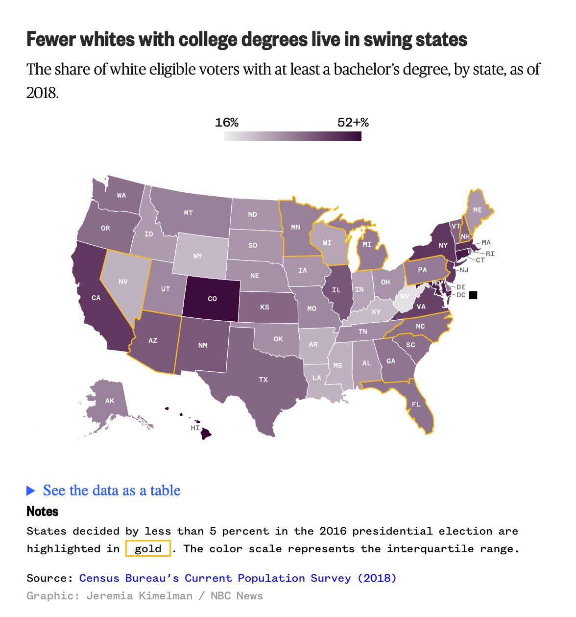 There are a few reasons why I think this is misguided. The most glaring issue is in counting raw votes. Although there may not be as many educated whites in Wisconsin as there are in Colorado, there still are some—27% of the state, by his reckoning—and Hillary Clinton’s razor-thin loss there means that if just 2 percent of them switch from voting for Donald Trump in 2016 to a Democrat in 2020 the state will probably flip from red to blue, all else being equal (which of course it won’t be). While swings in the suburbs are indeed bigger in blue states, even small shifts could decide the election.