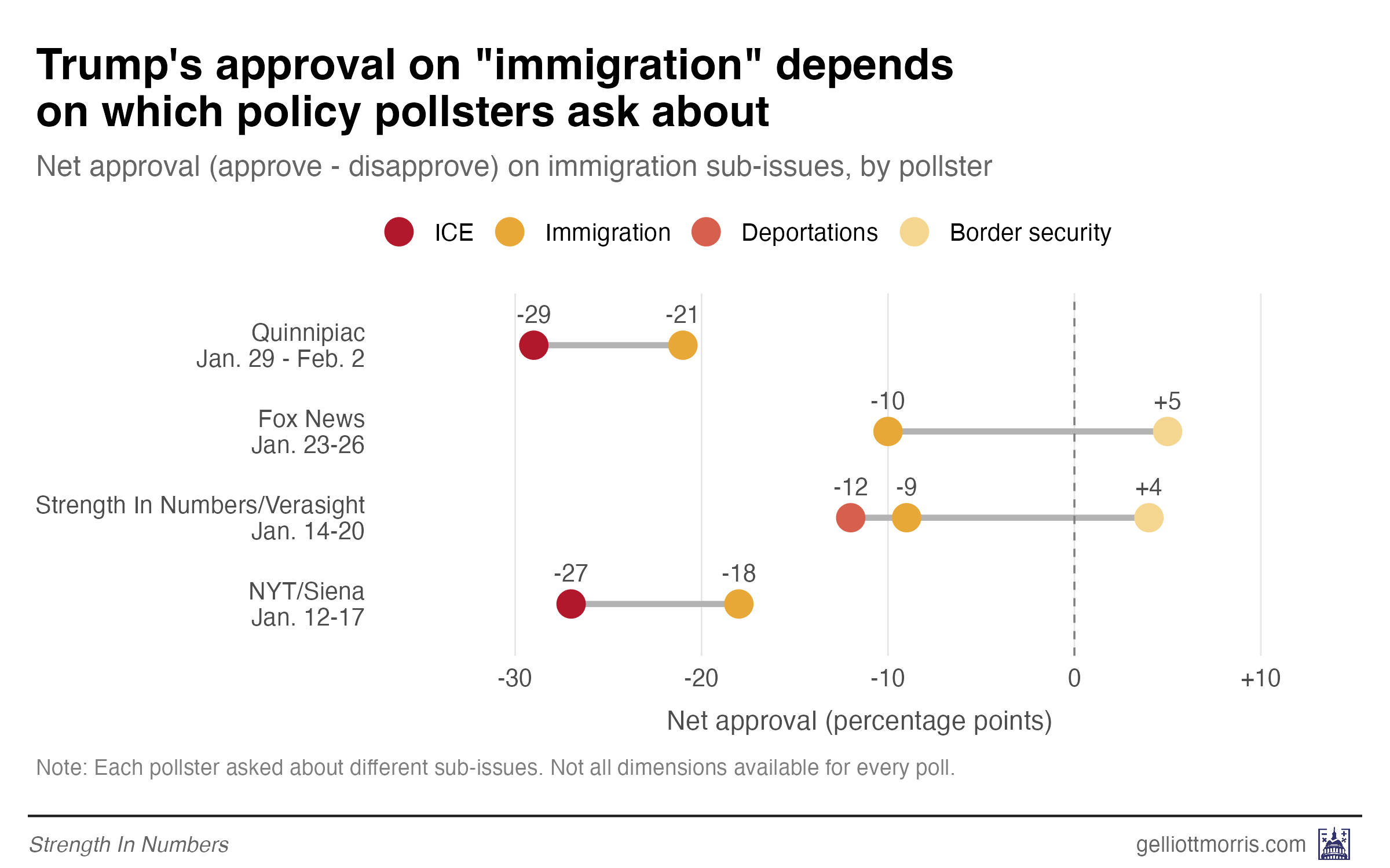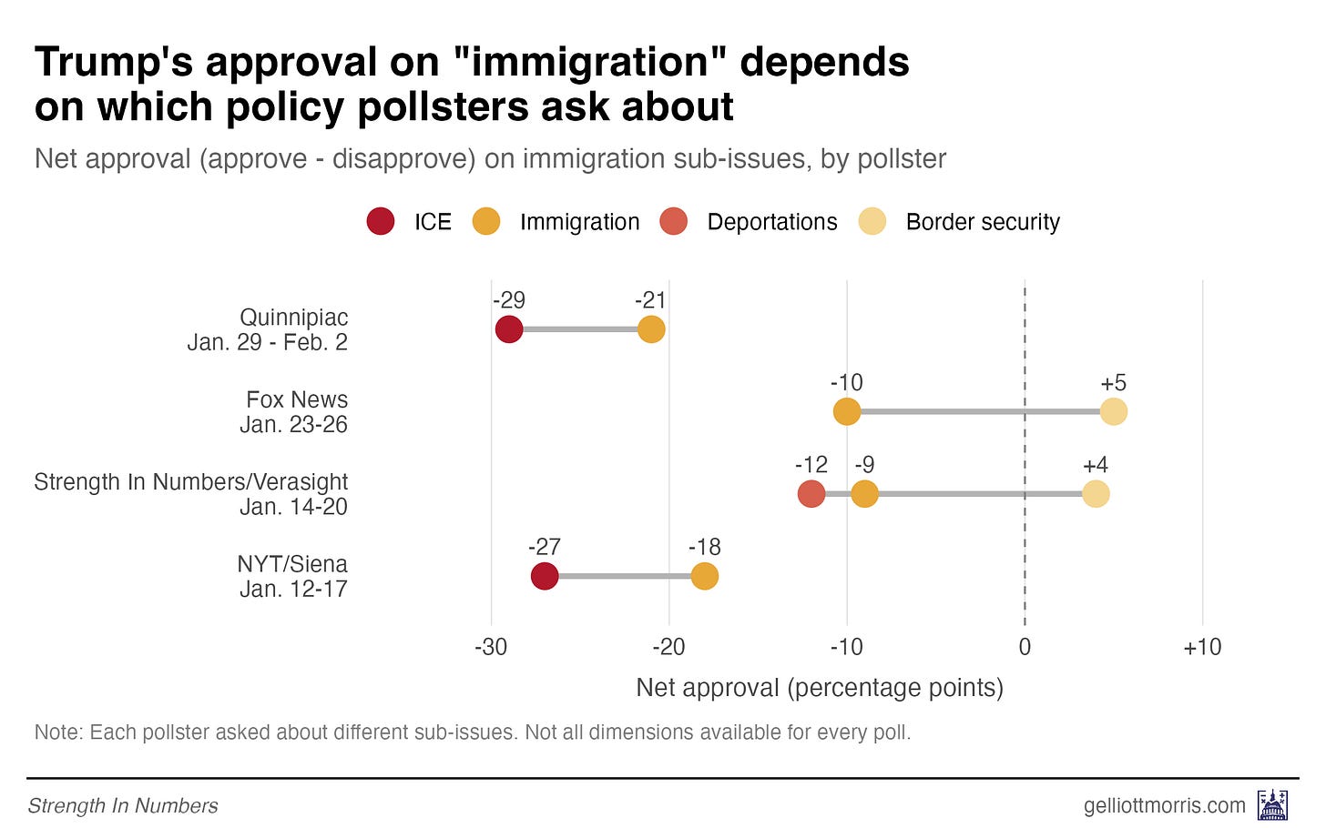 Trump's approval on immigration varies by nearly 20 points depending on whether respondents are asked about border security, deportations, ICE, or immigration in general