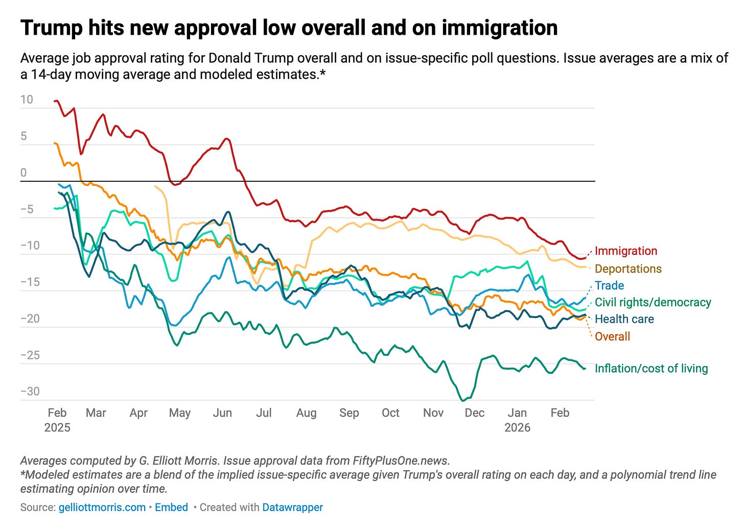 And this is what Democrats are betting on the shutdown. Nevada Senator Catherine Cortez-Masto said on The Daily podcast on Feb. 19 that Democrats see an electoral opportunity in forcing Republicans to confront the president’s domestic troop deployments head-on. Every day the shutdown continues, says Masto, the immigration conversation is about ICE agents operating in American cities, not border crossings. That moves the issue from comparably favorable terrain for Trump — where nearly 50% approve — to a place where he is doing much worse.