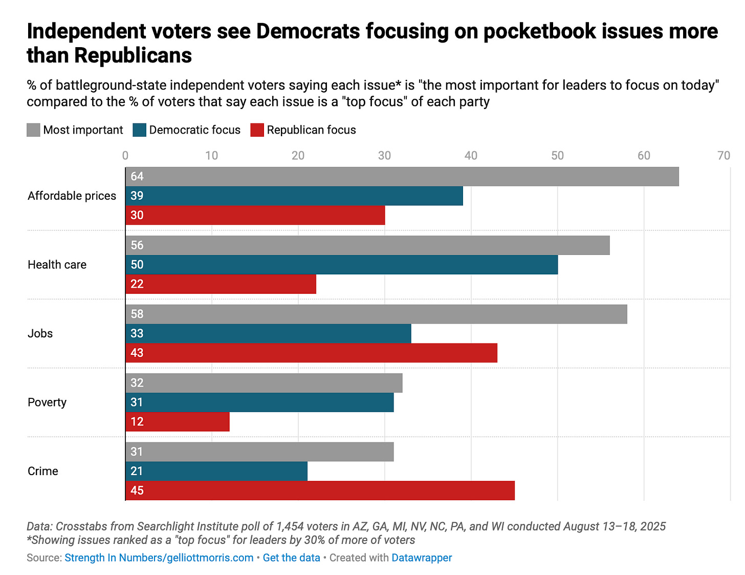 I have some criticisms of the way the authors come to their conclusions. For one thing, while making prescriptions for the future of the party, the authors are surprisingly ignorant of current data that shows the Democrats rebounding with voters who care about the economy, and Republicans doing as poorly as or worse than Democrats on issue focus. The report also spends little time discussing the role of inflation in Kamala Harris’s loss in 2024, and frames the economy as an exclusively Democrat vs Republican problem instead of acknowledging an incumbent vs opposition dynamic at play last year — a big mistake that I have covered before.