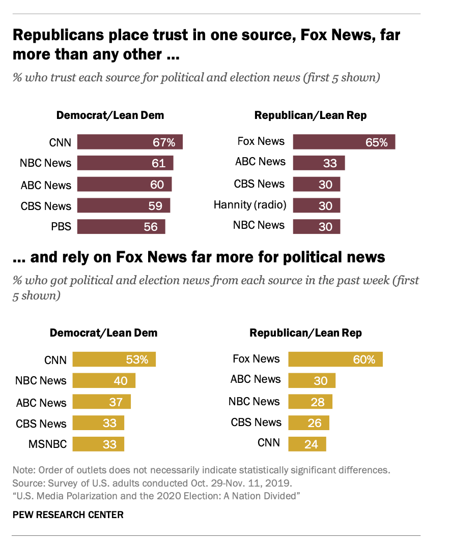 The Republican Party’s obsession with Fox News is laid bare in Pew’s new polling. The authors of the report write that 65% of Republicans and Republican-leaning Independents trust Fox News as a source for political and election news, more than 30 percentage points higher than the next-trusted outlet (ABC News). Conservative Republicans are even more devoted (and deferential) to the channel. Pew’s researchers also find that these divides have widened over time.