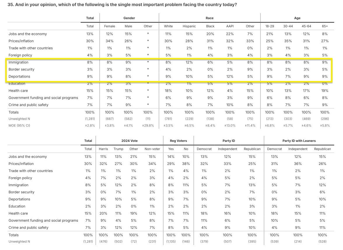 And consider that “what is the most important problem facing the country?” is not the same question as “why do you disapprove of Trump now?” And also, we should account for the fact that half of the Times data being used for those calculations is coming from a September sample. The issue landscape has changed a lot since September: As my polling has shown, more Americans now pick immigration/deportations as their most important problem than pick jobs and the economy. This is a big change in my data since September, so maybe the Times crosstab is understating the role immigration is playing in Trump’s lower numbers now.
